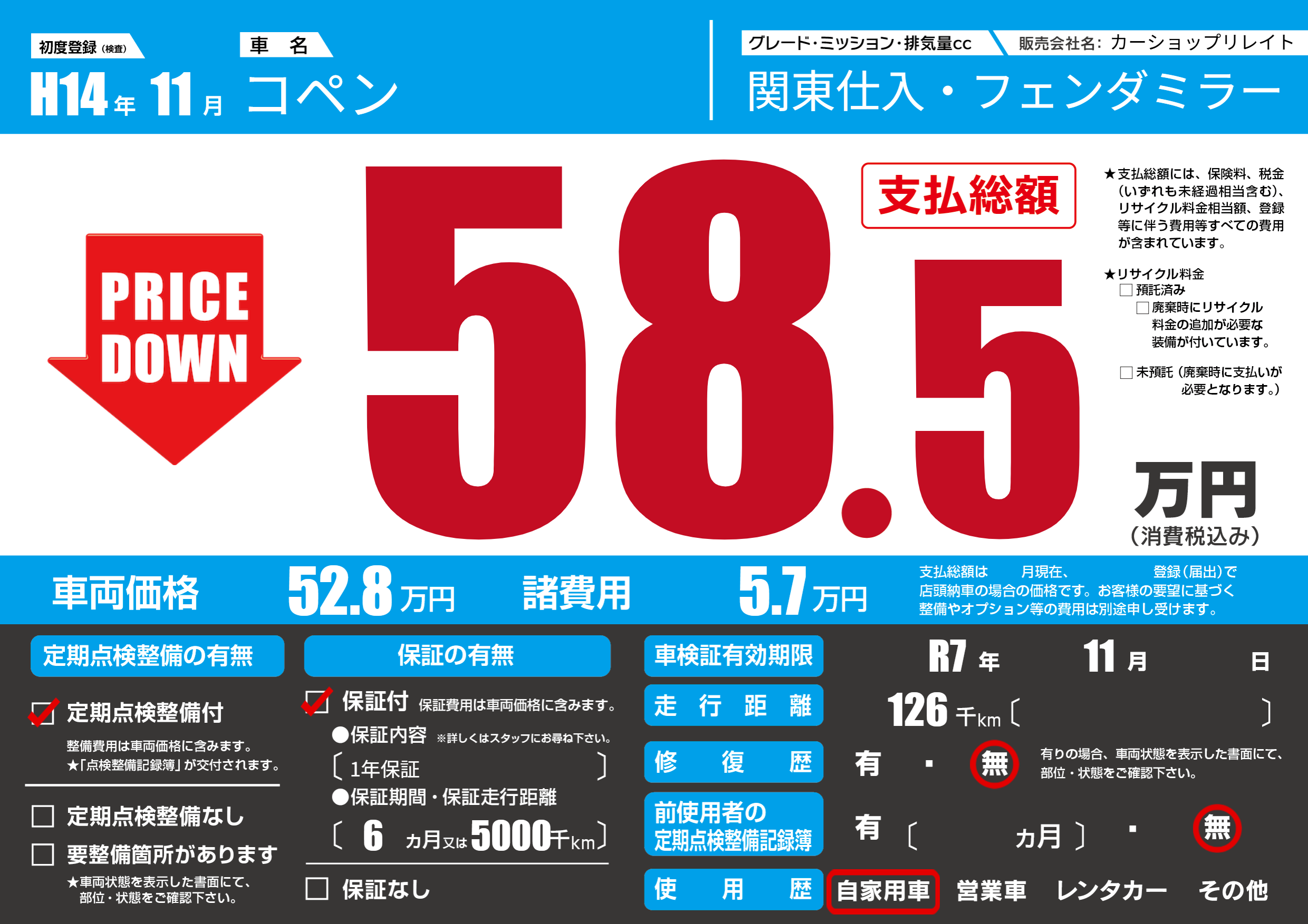 | 走行キロ | 12.6万km | 初年度登録 | H14年11月 |