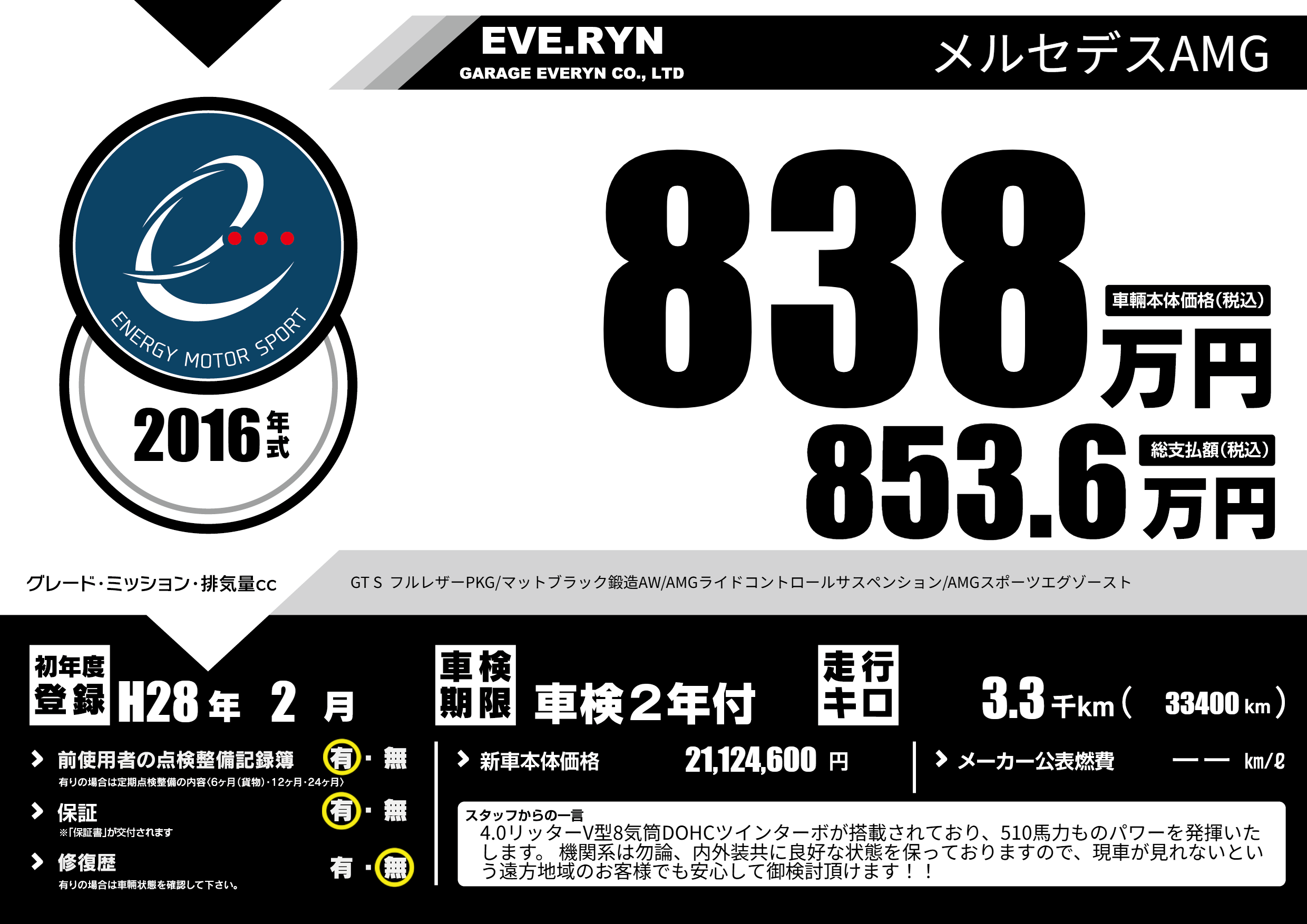 | 車名 | メルセデスAMG | グレード ミッション 排気量 |