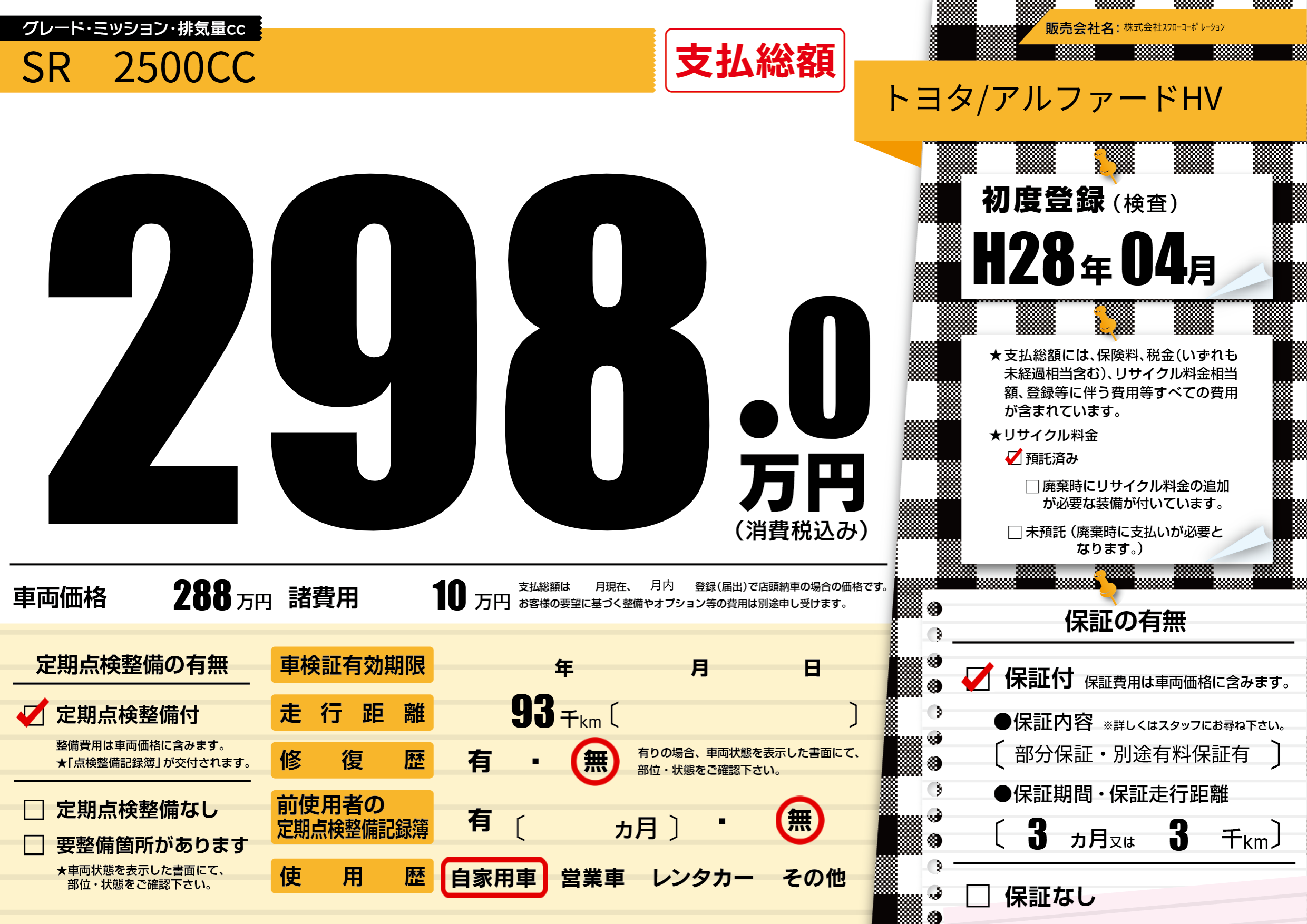 保証付き 保証内容(部分保証・別途有料保証有) 3ヶ月または(3)千kmまで |