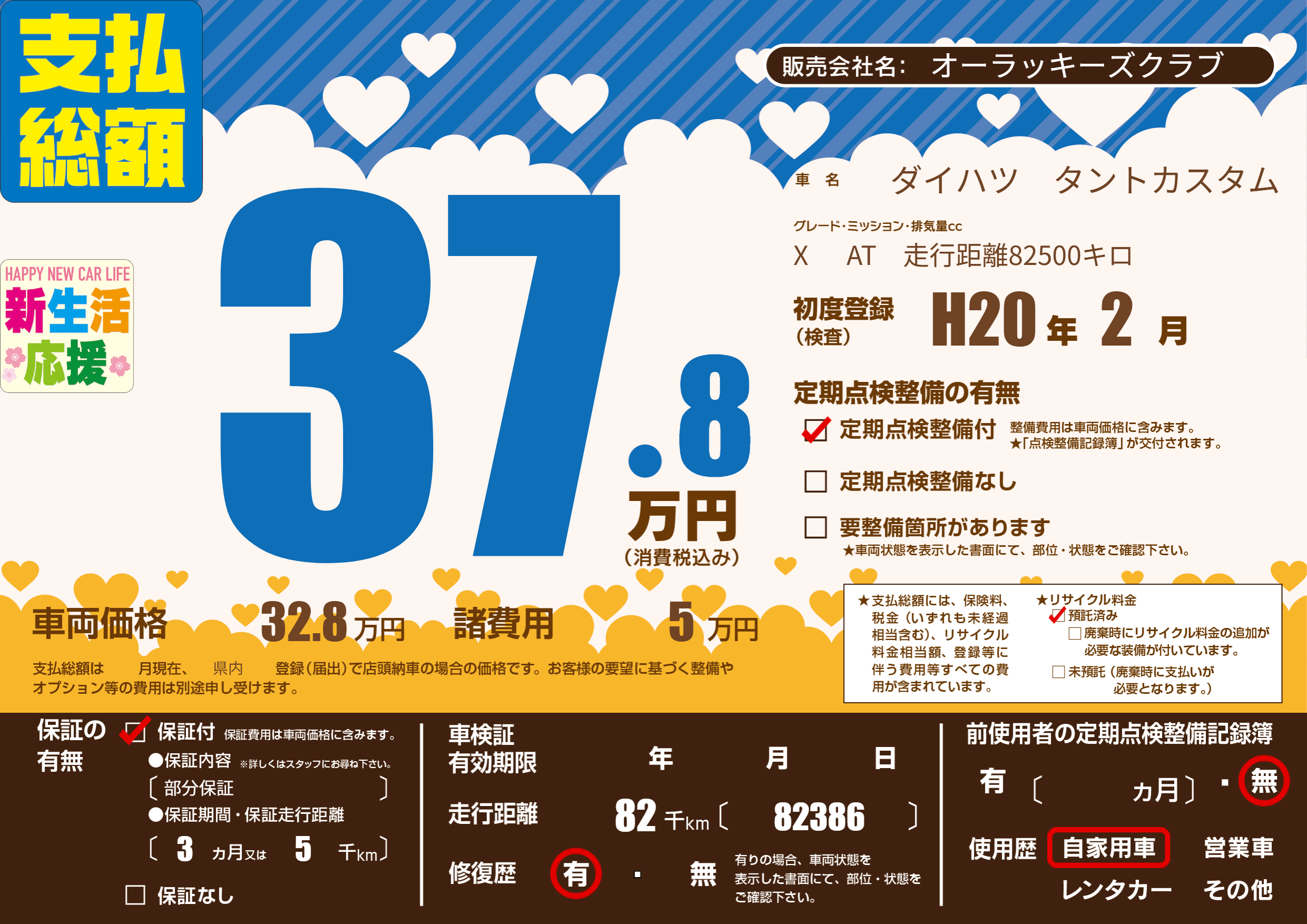 | 車名 | ダイハツ タントカスタム | グレード ミッション 排気量 |