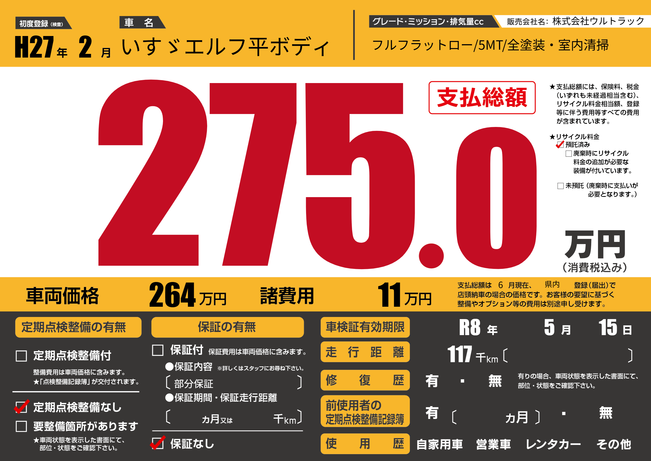 | 車名 | いすゞエルフ平ボディ | グレード ミッション 排気量 |