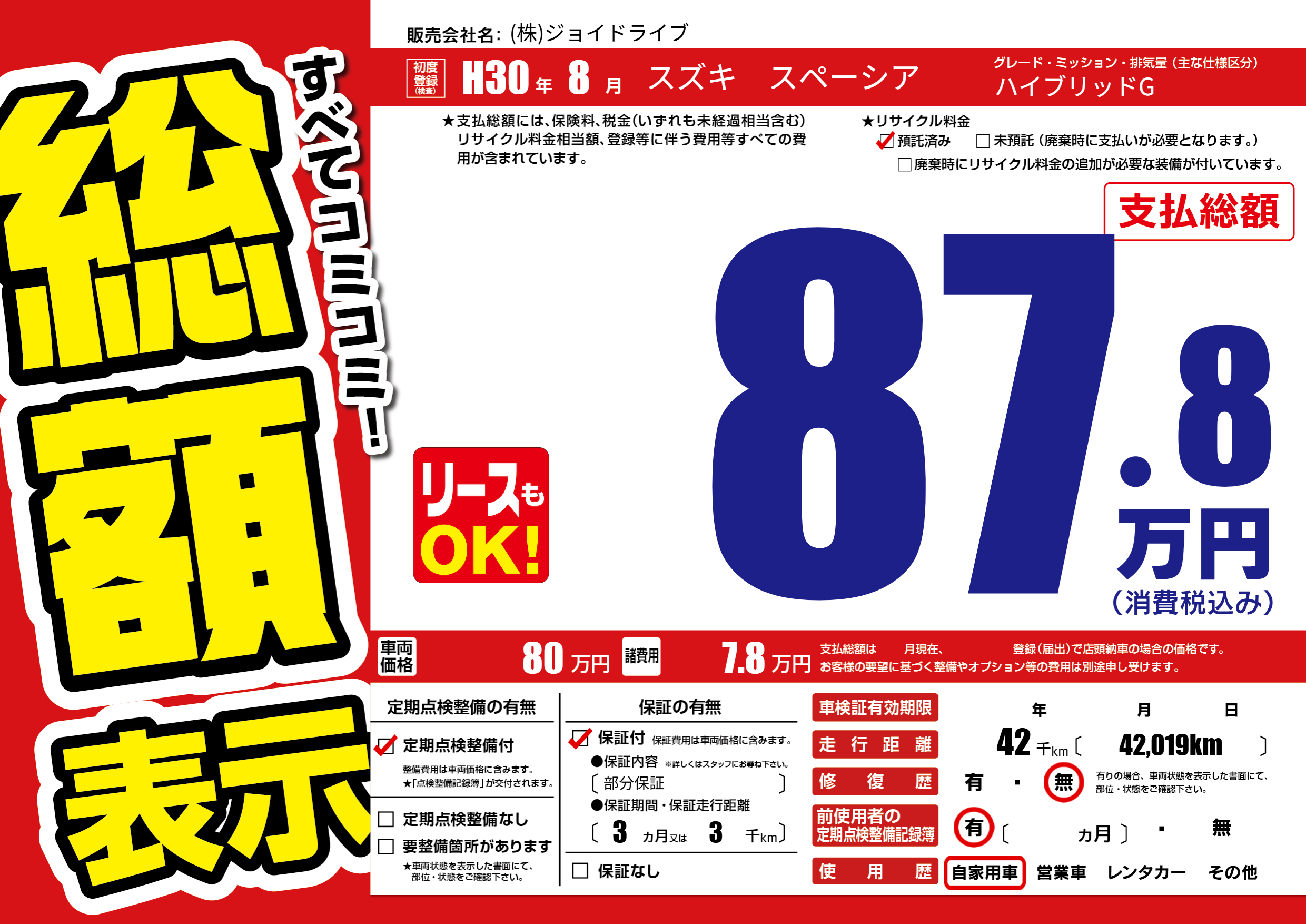 | 走行キロ | 4.2万km | 初年度登録 | H30年8月 |