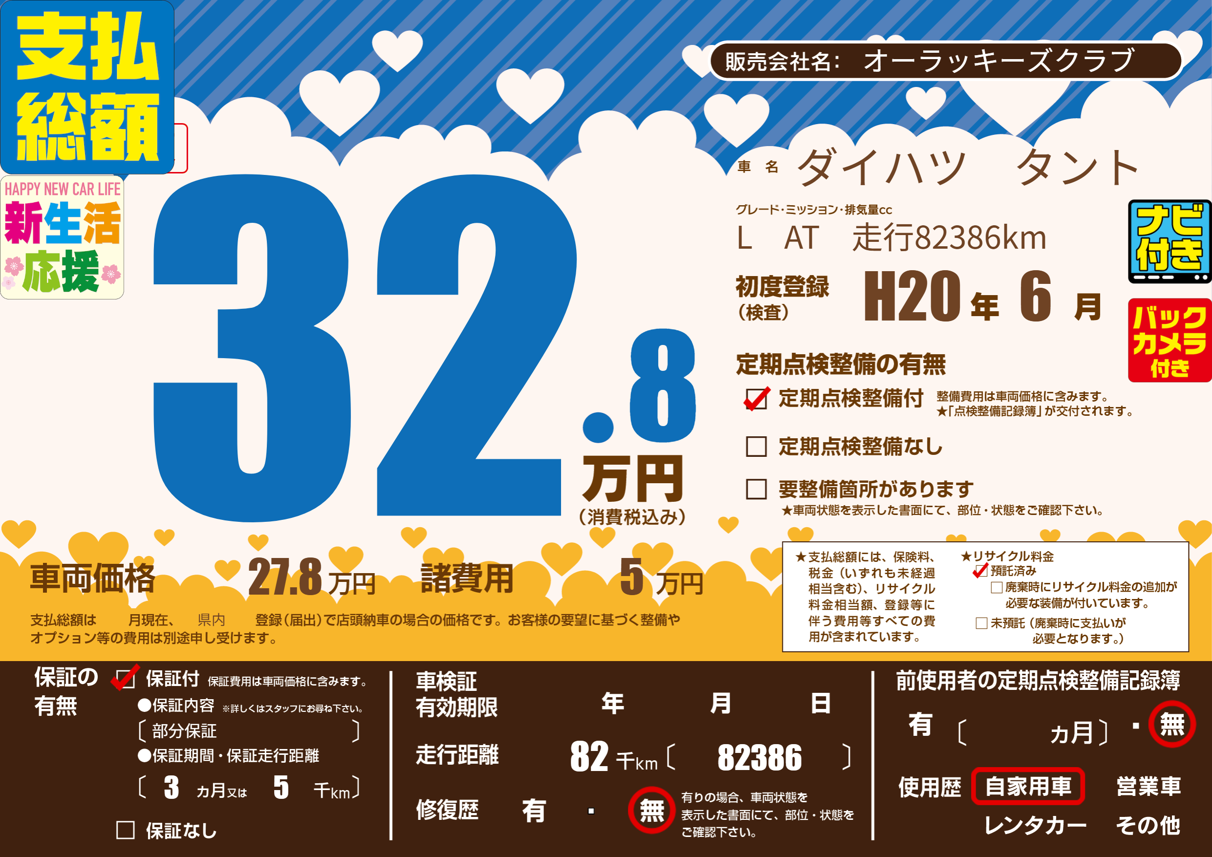 | 車名 | ダイハツ タント | グレード ミッション 排気量 |