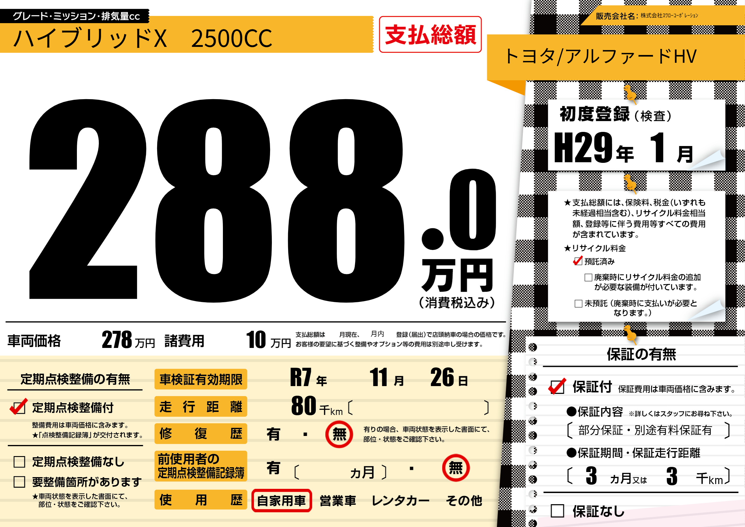 | 車名 | トヨタ/アルファードHV | グレード ミッション 排気量 |