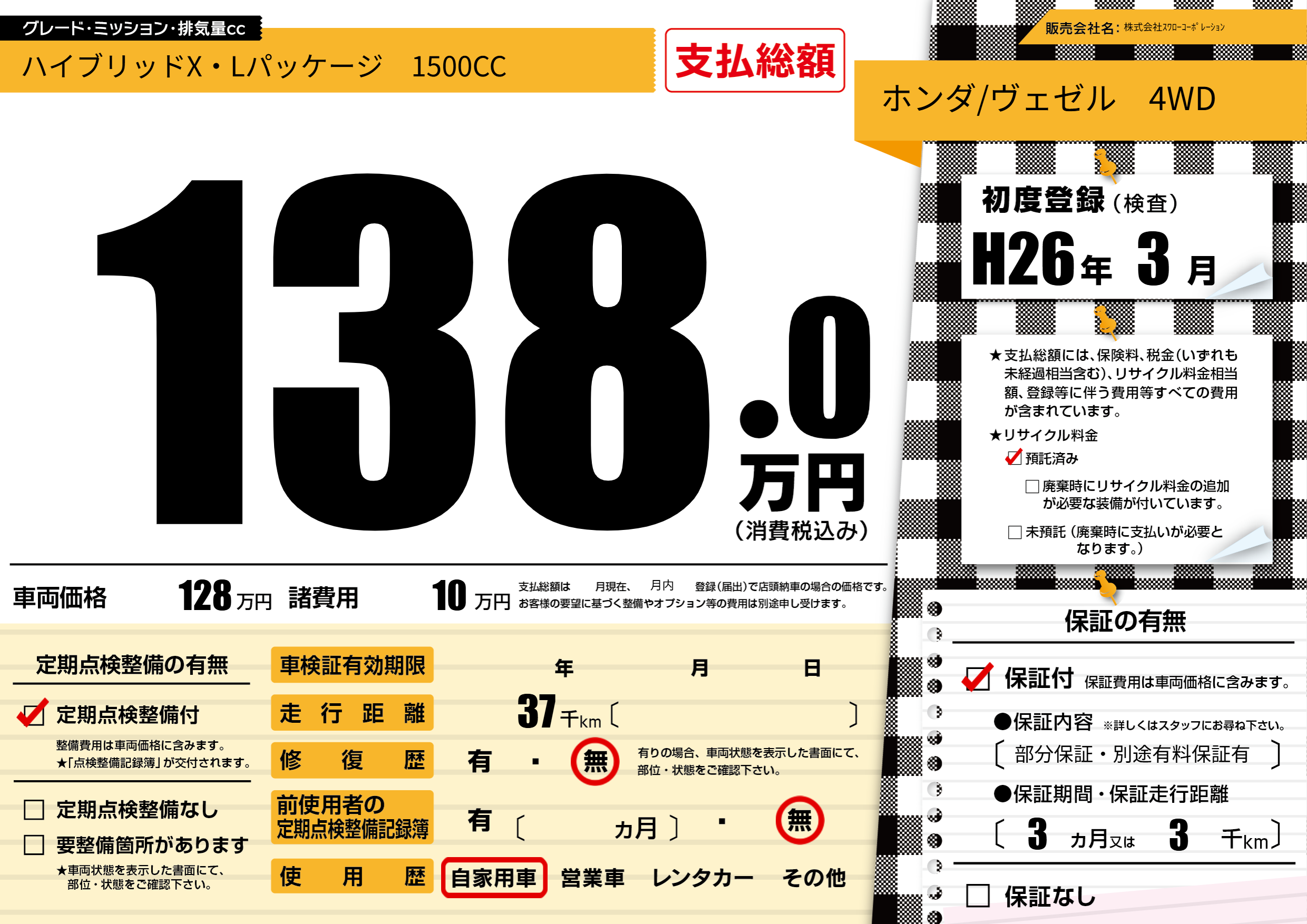 保証付き 保証内容(部分保証・別途有料保証有) 3ヶ月または3千km |