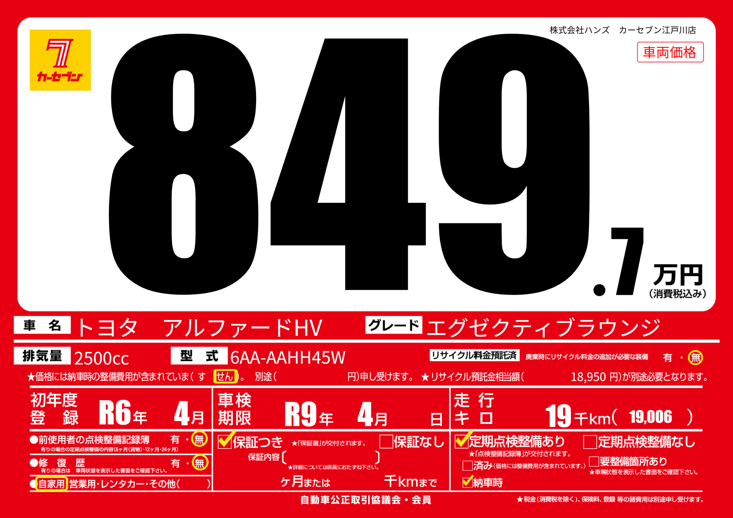 | 車名 | トヨタ アルファードHV | グレード ミッション 排気量 |