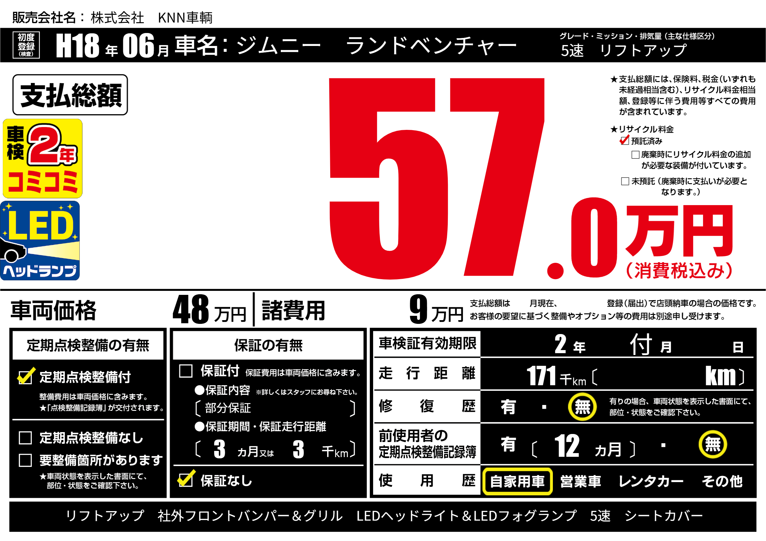 | 走行キロ | 17.1万km | 初年度登録 | H18年06月 |