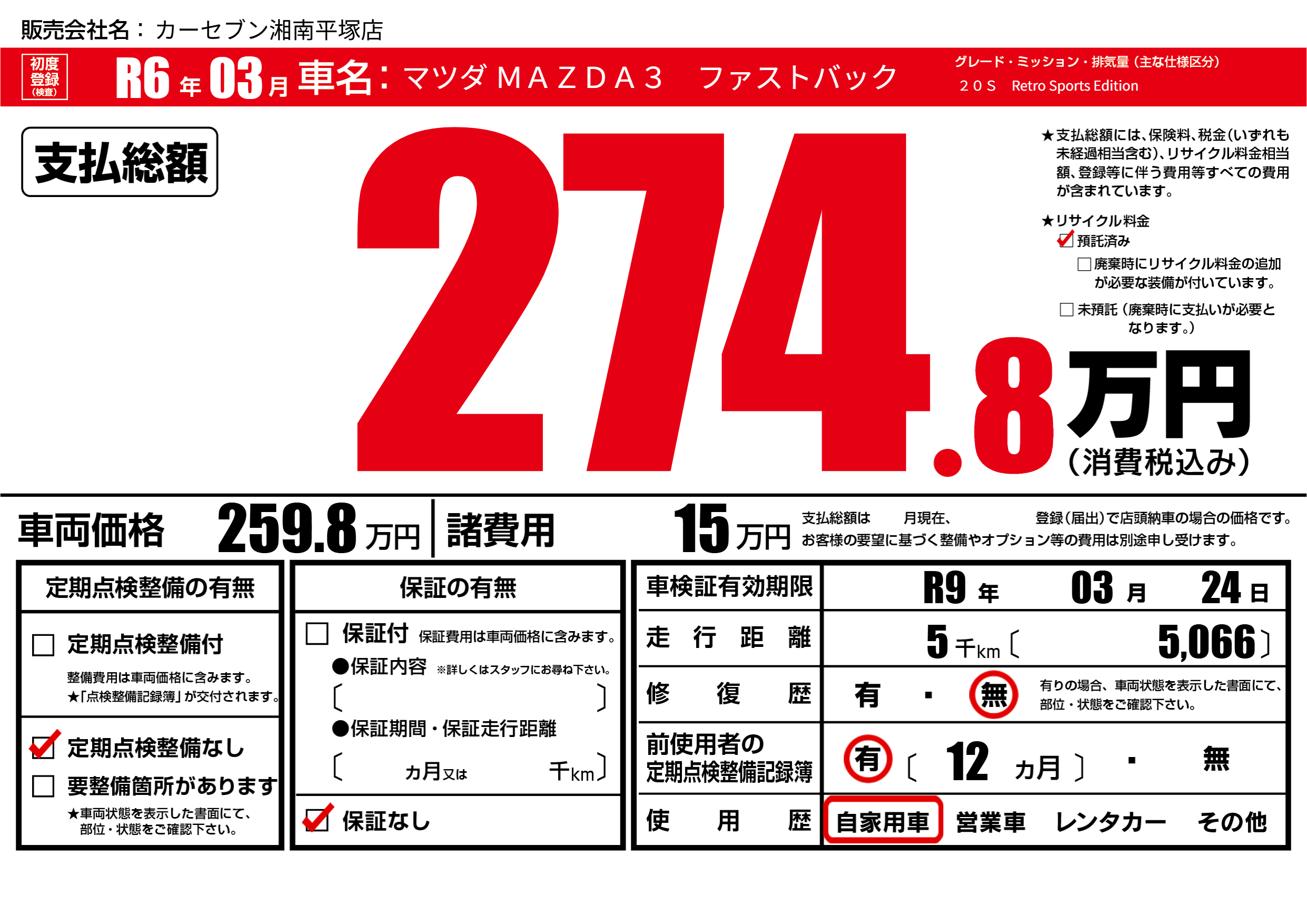 | 車名 | マツダ MAZDA3 ファストバック | グレード ミッション 排気量 |