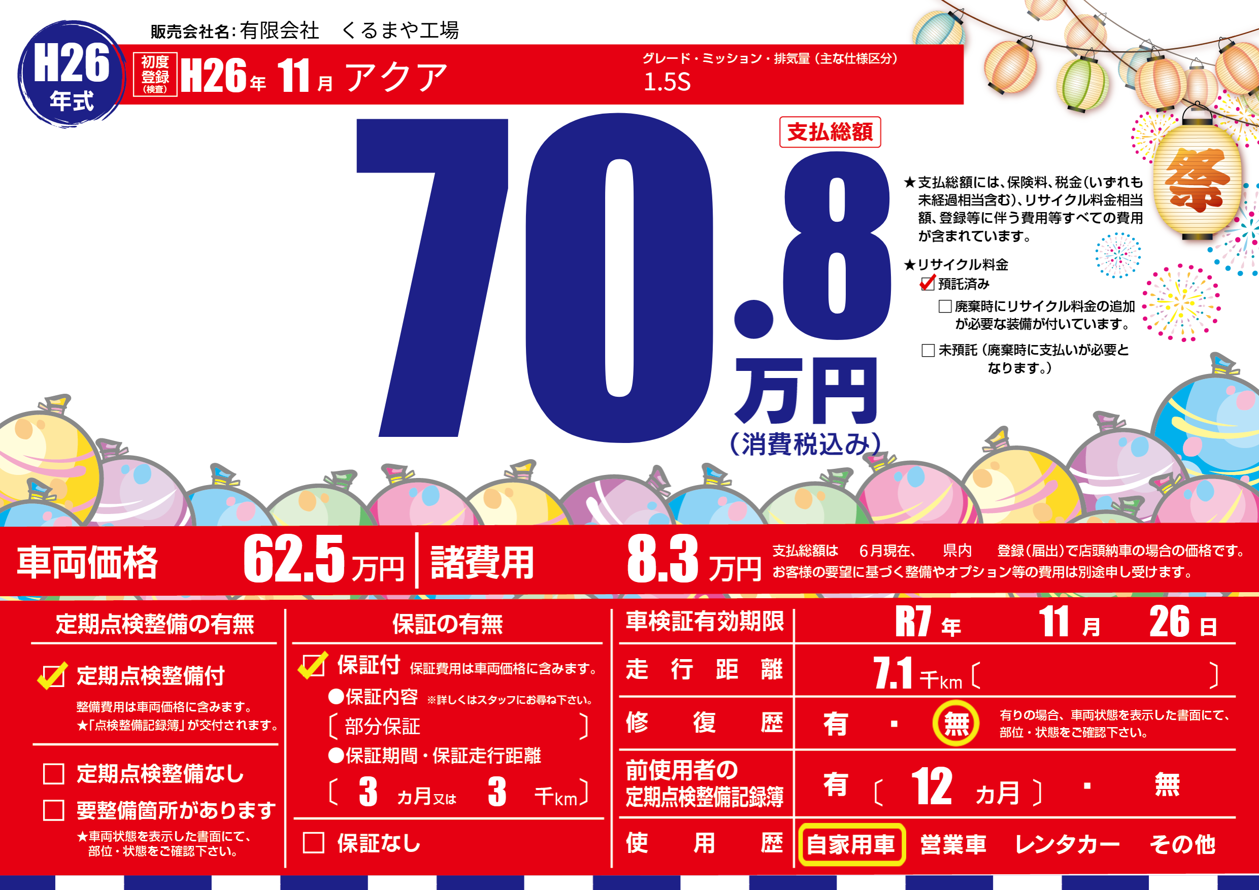 | 走行キロ | 0.7万km | 初年度登録 | H26年11月 |