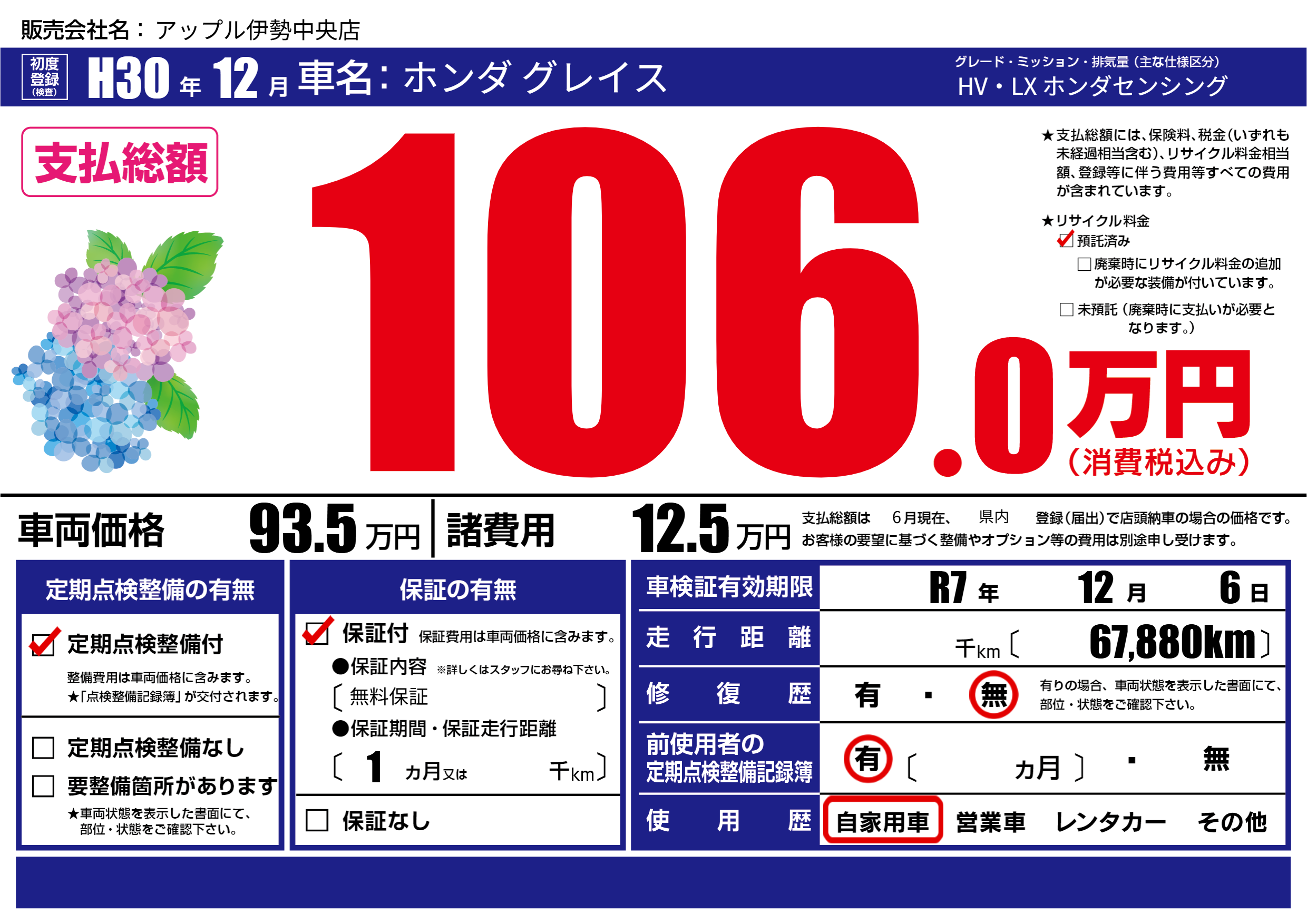 | 車名 | ホンダ グレイス | グレード ミッション 排気量 |