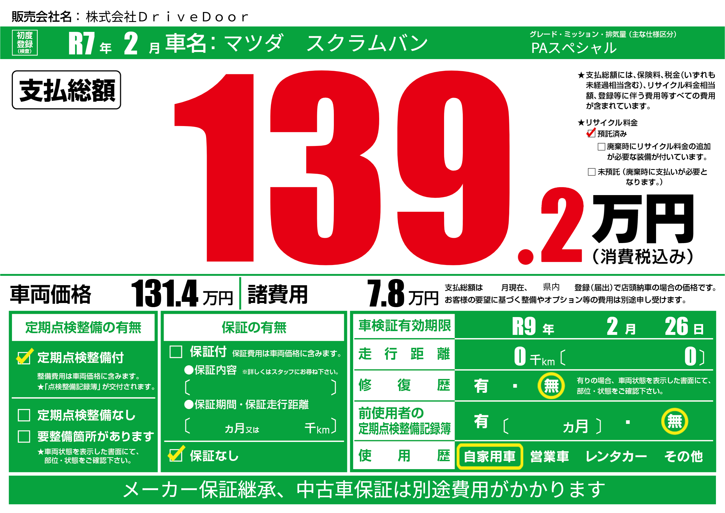 | 走行キロ | - | 初年度登録 | R7年2月 |