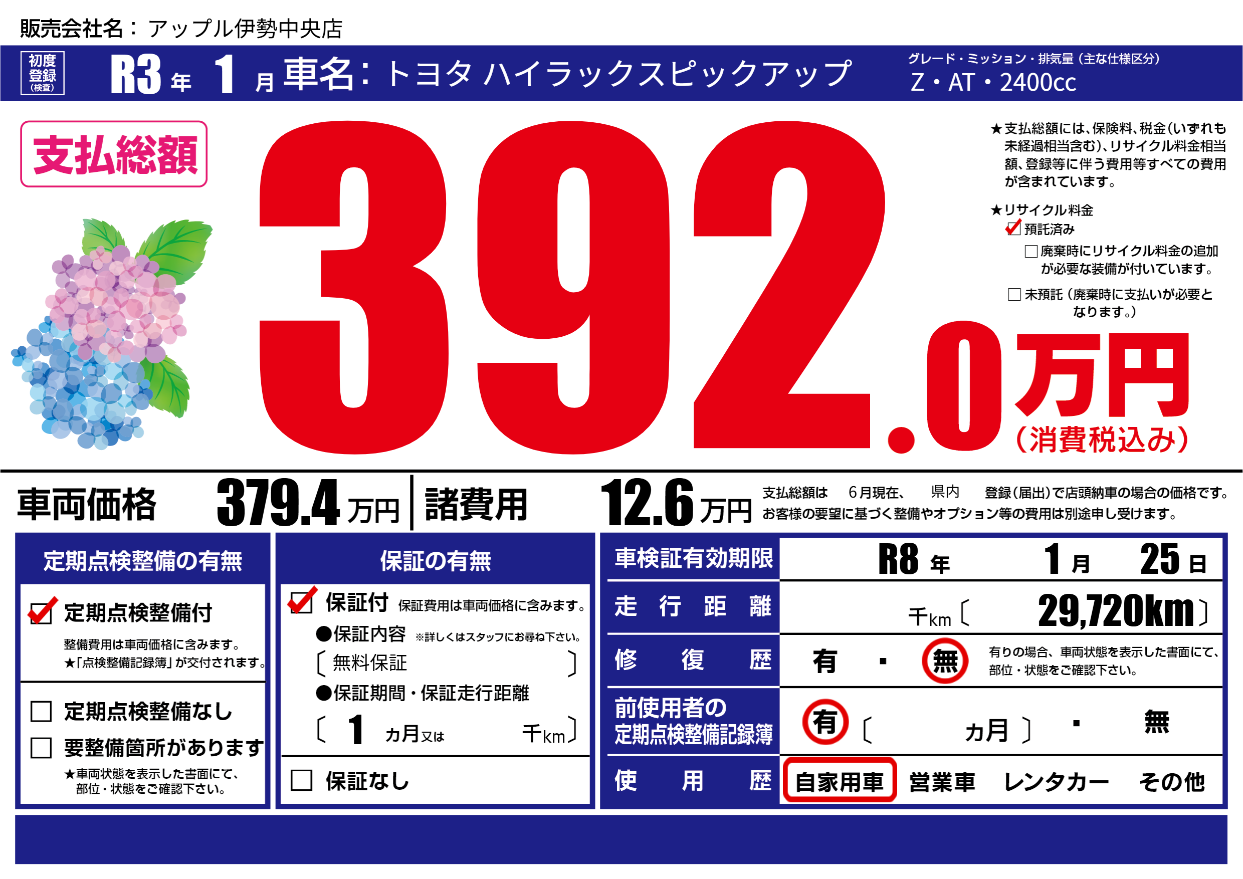 | リサイクル料金 預託済 |