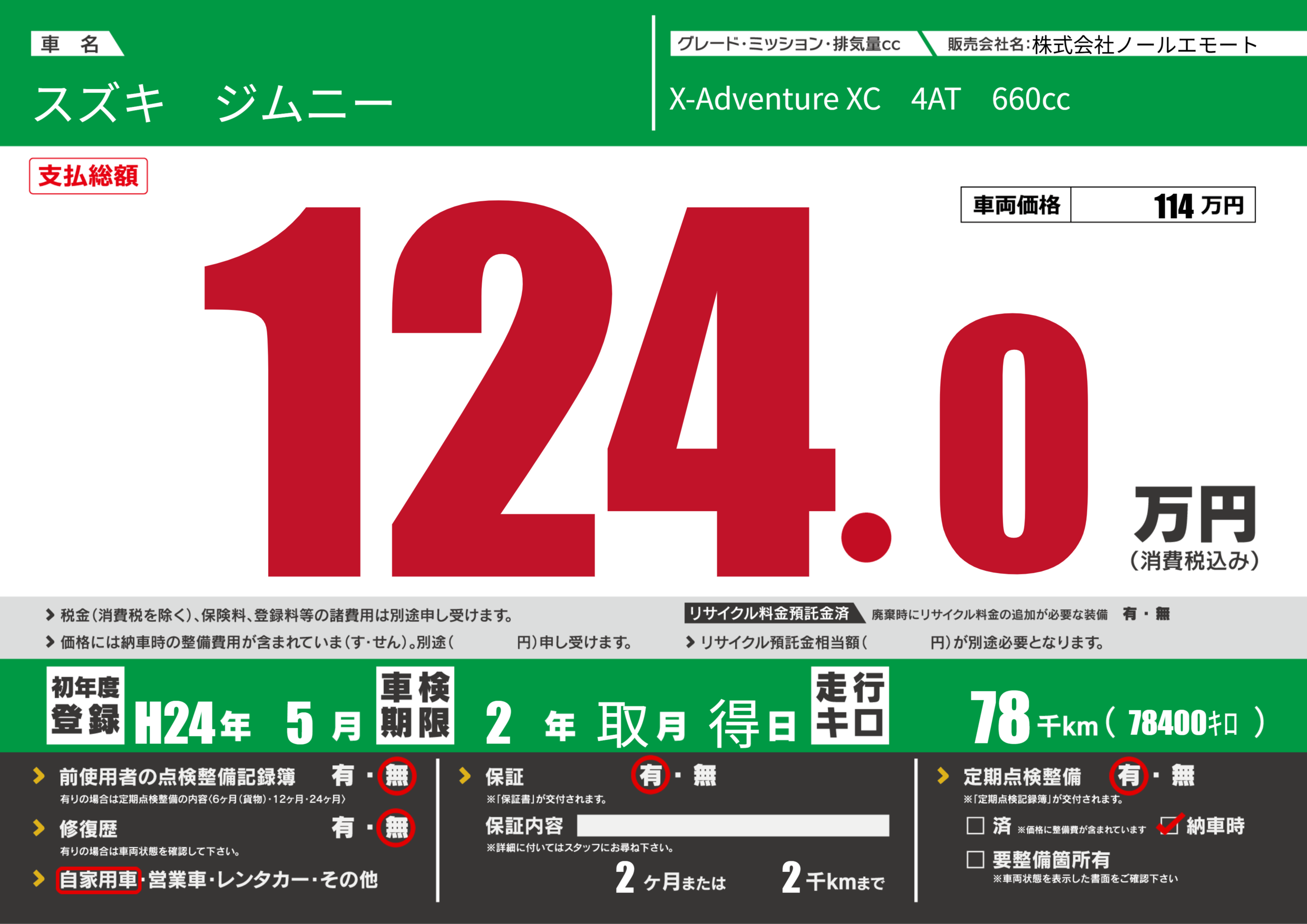 | 車名 | スズキ ジムニー | グレード ミッション 排気量 |