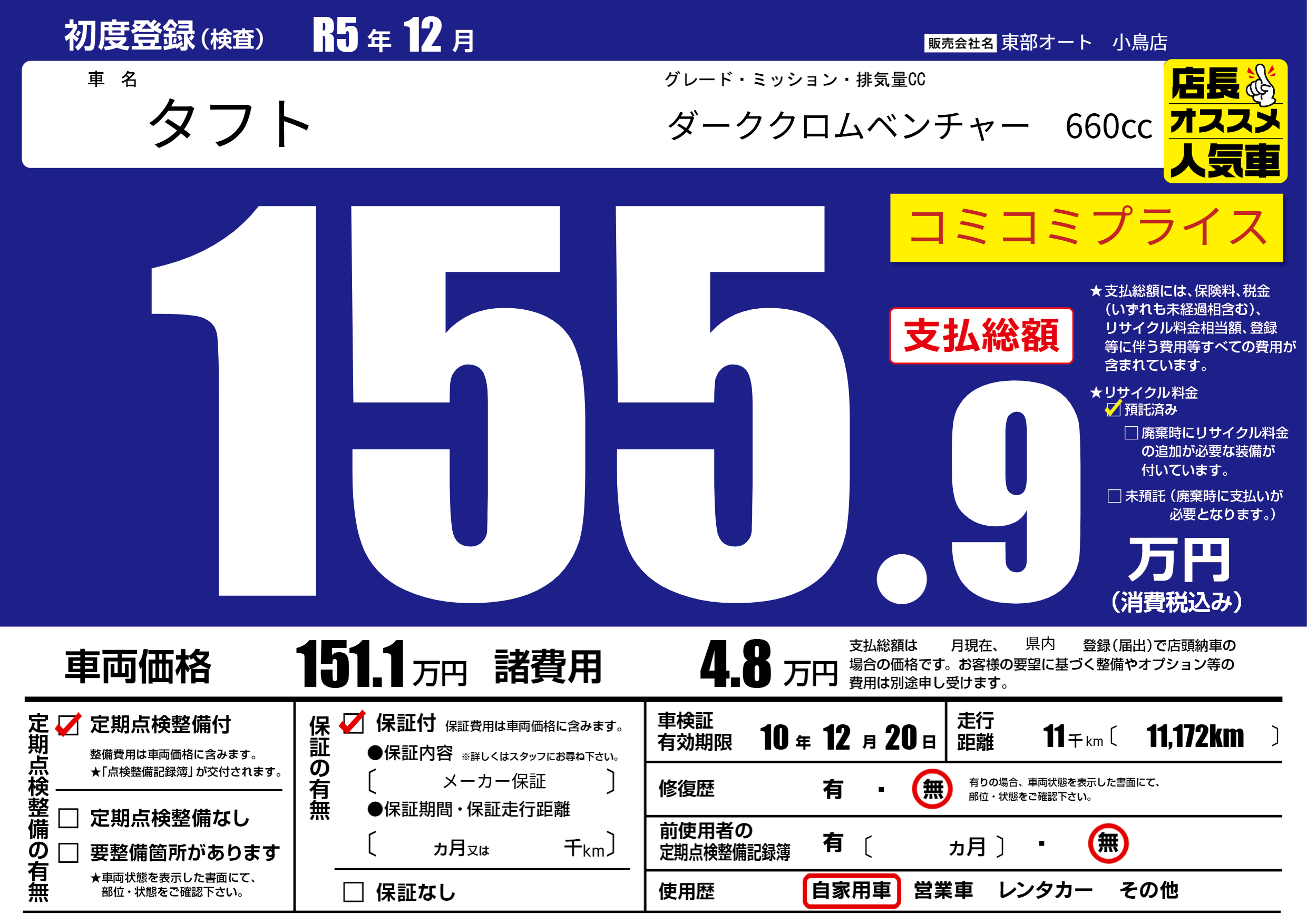 | 走行キロ | 1.1万km | 初年度登録 | R5年12月 |