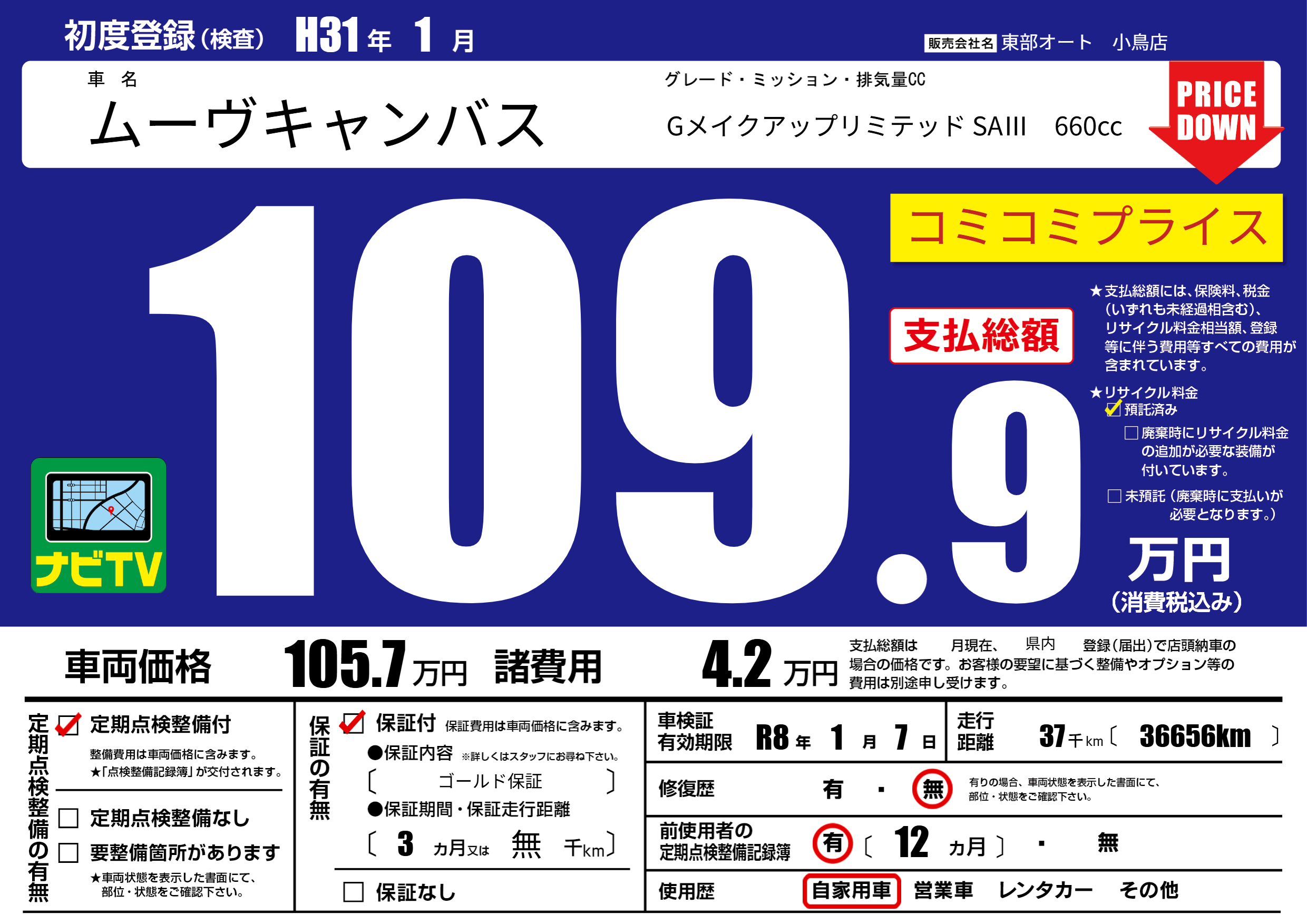 | 走行キロ | 3.7万km | 初年度登録 | H31年1月 |