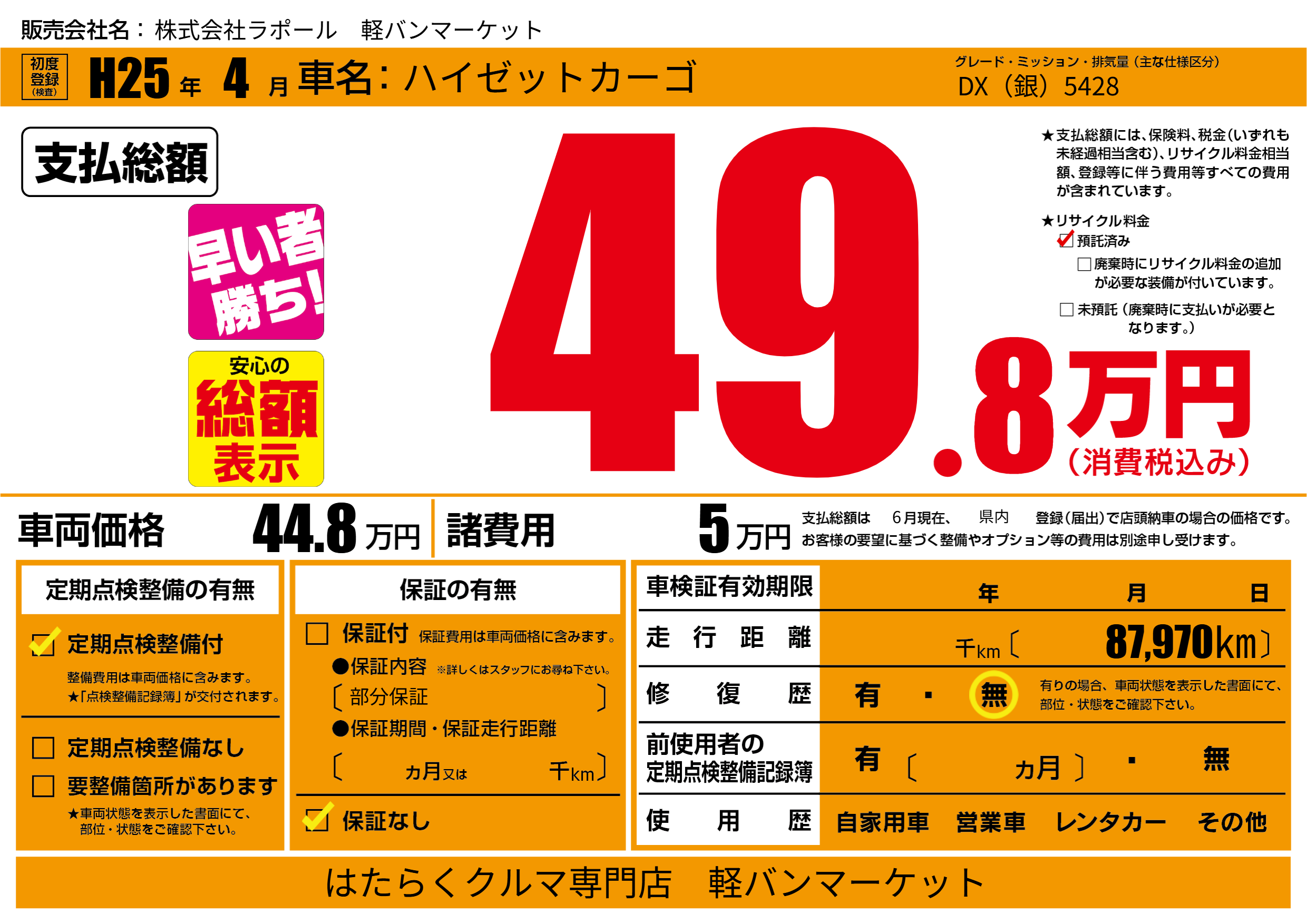 | 走行キロ | - | 初年度登録 | H25年4月 |