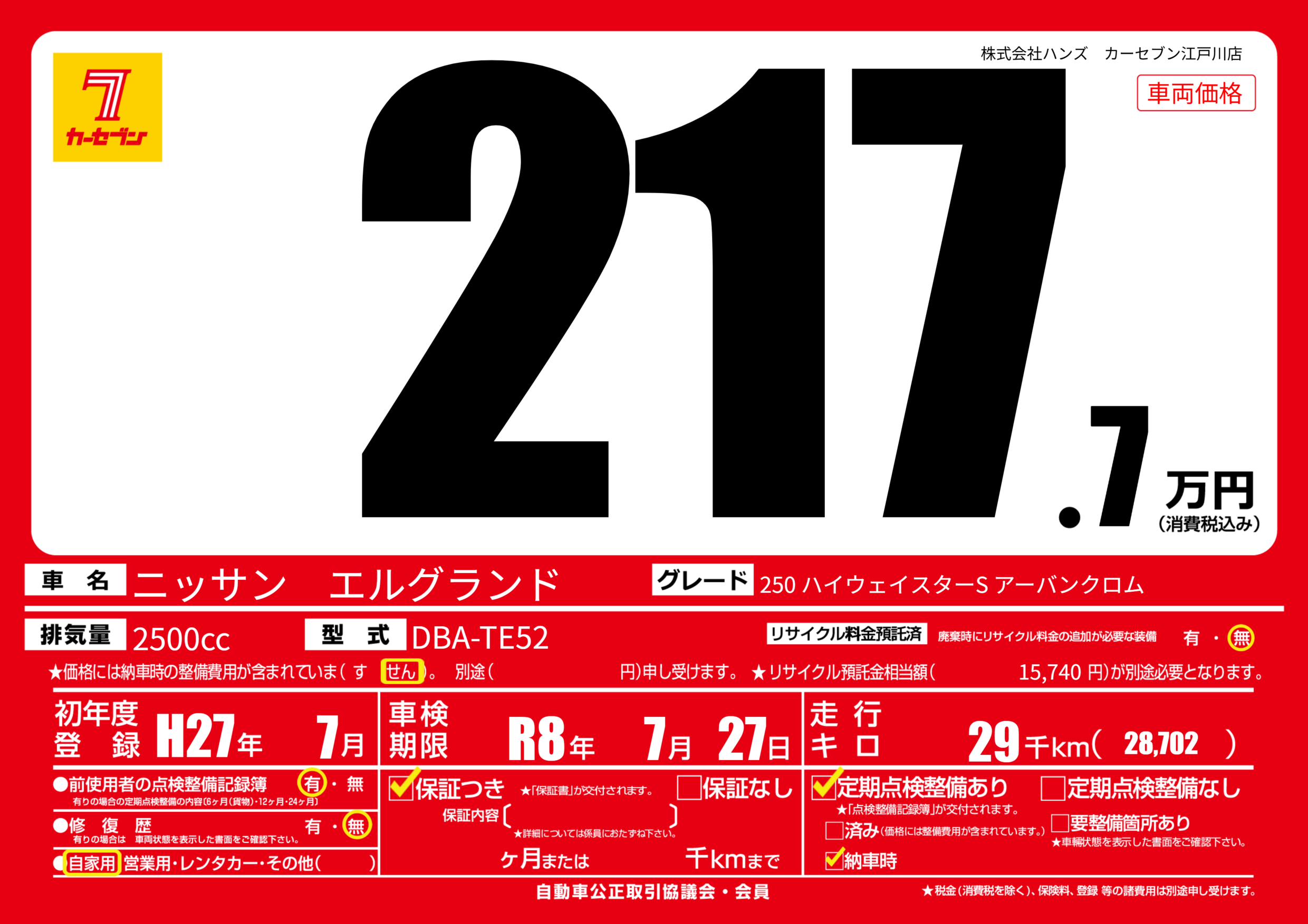 | 車名 | ニッサン エルグランド | グレード ミッション 排気量 |
