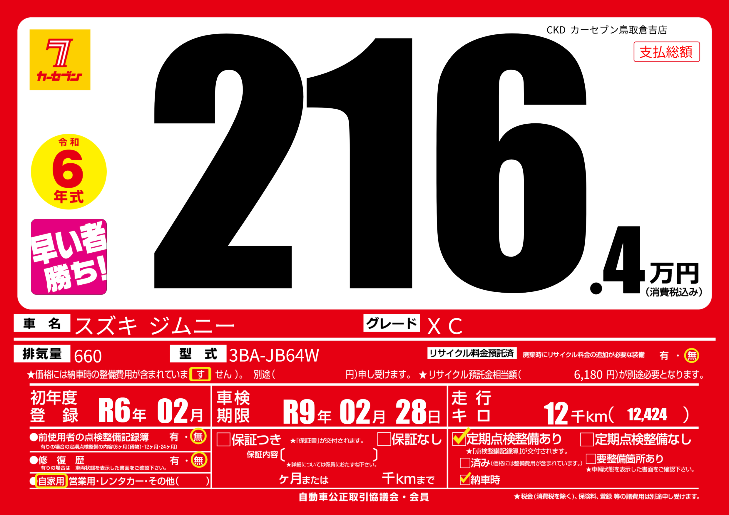 | 走行キロ | 1.2万km | 初年度登録 | R6年02月 |