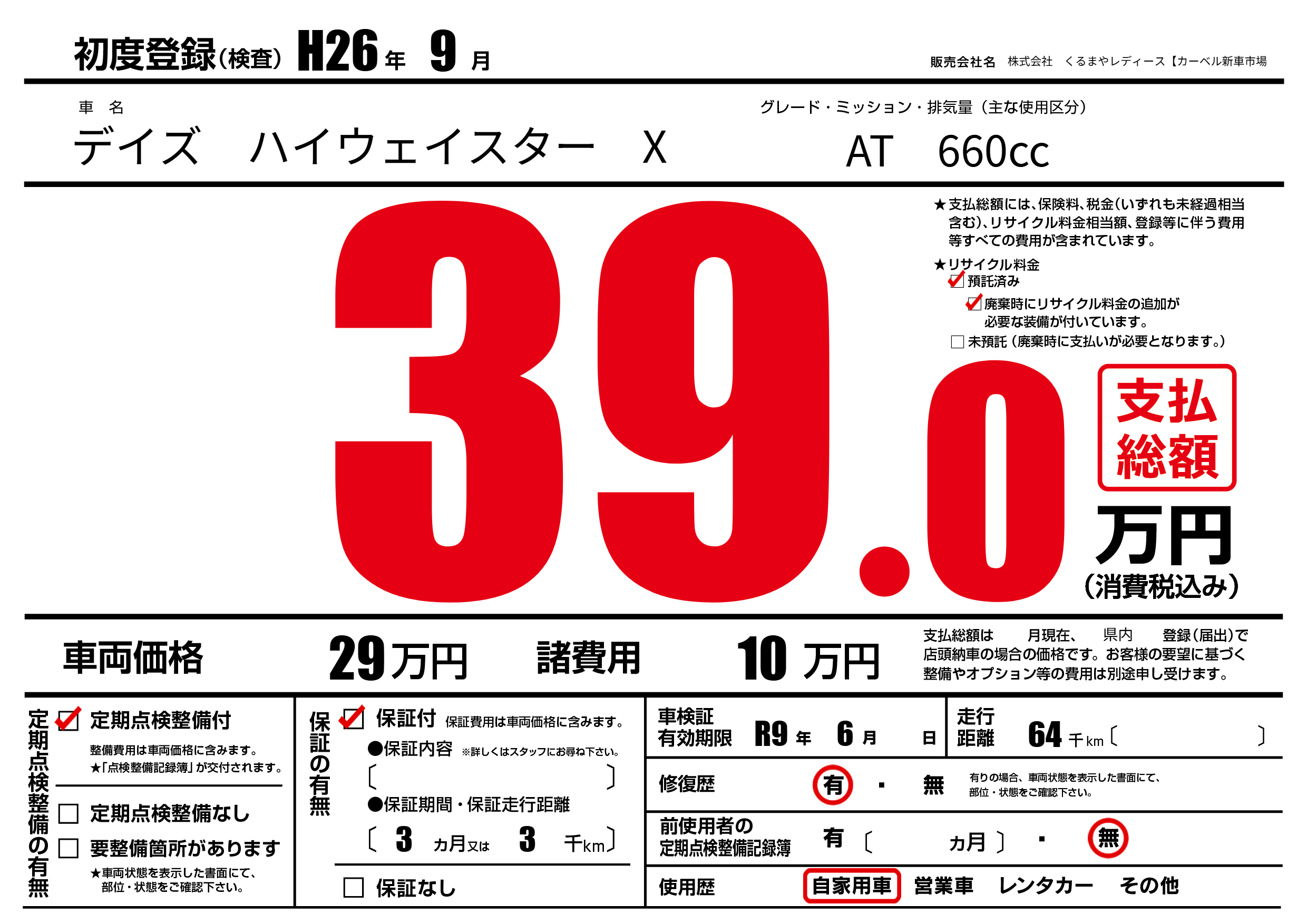 | 車名 | デイズ ハイウェイスター X | グレード ミッション 排気量 |