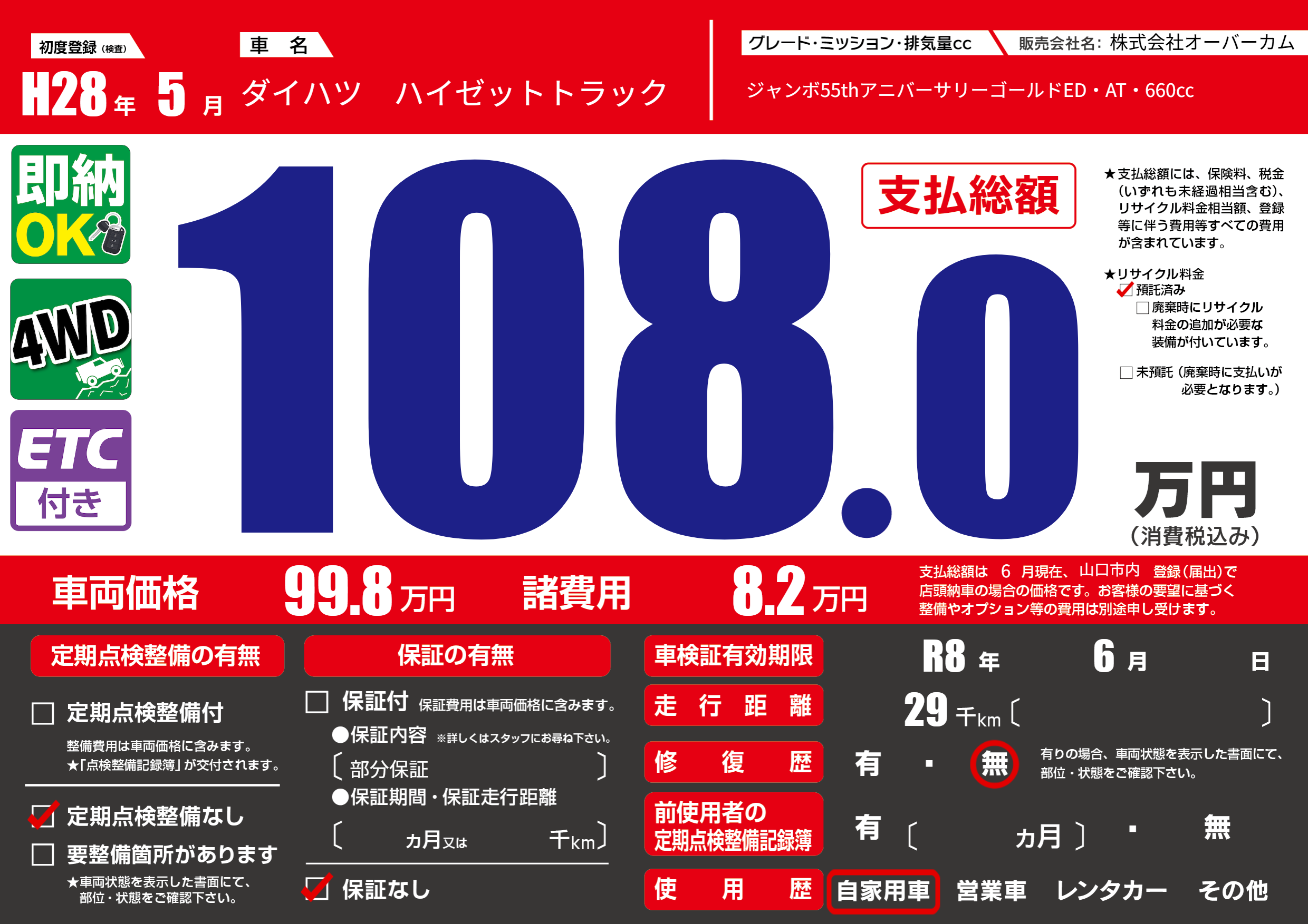 保証なし 保証内容(部分保証) ---ヶ月または()千kmまで |