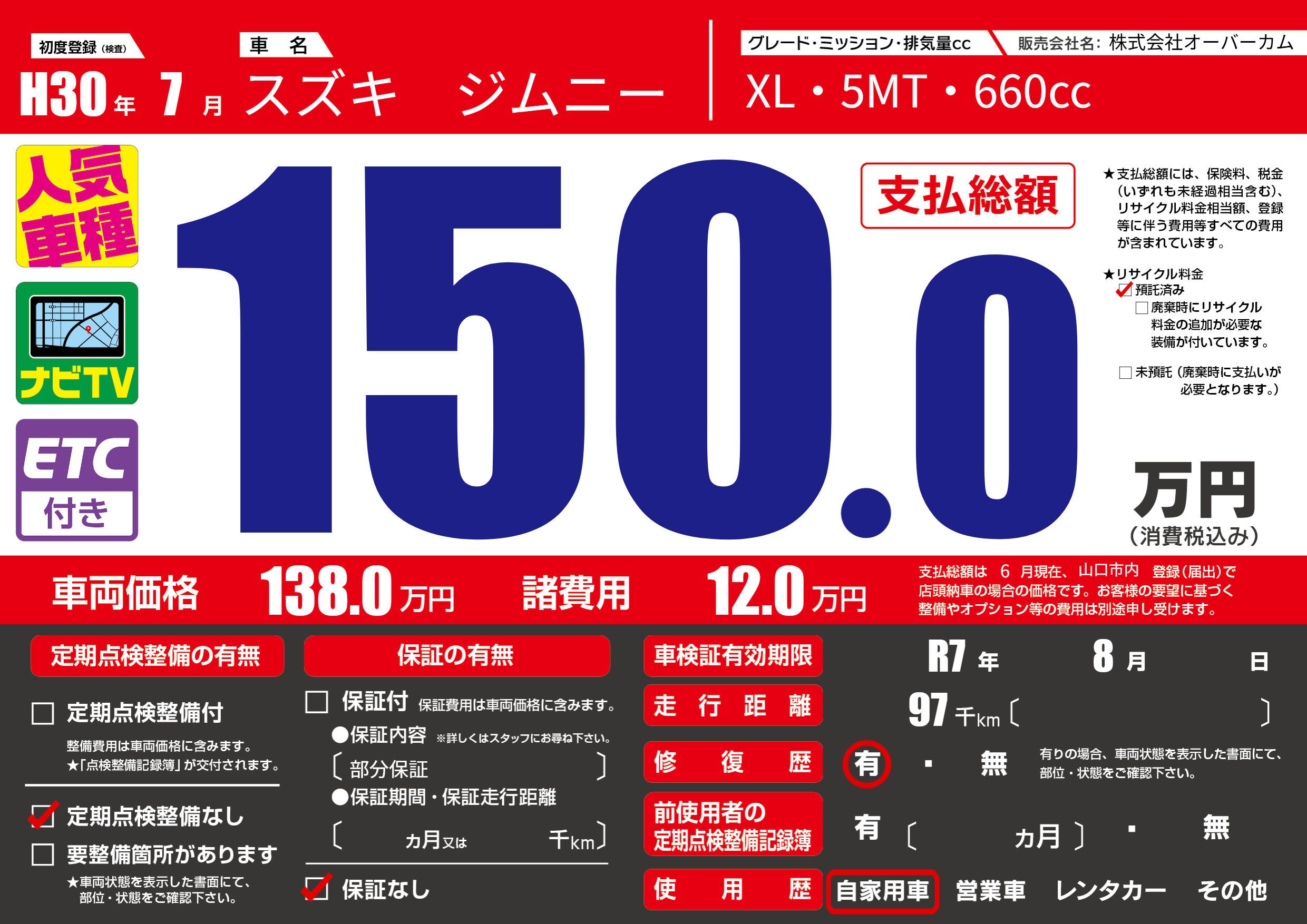 保証なし 保証内容(部分保証) ---ヶ月または()千kmまで |