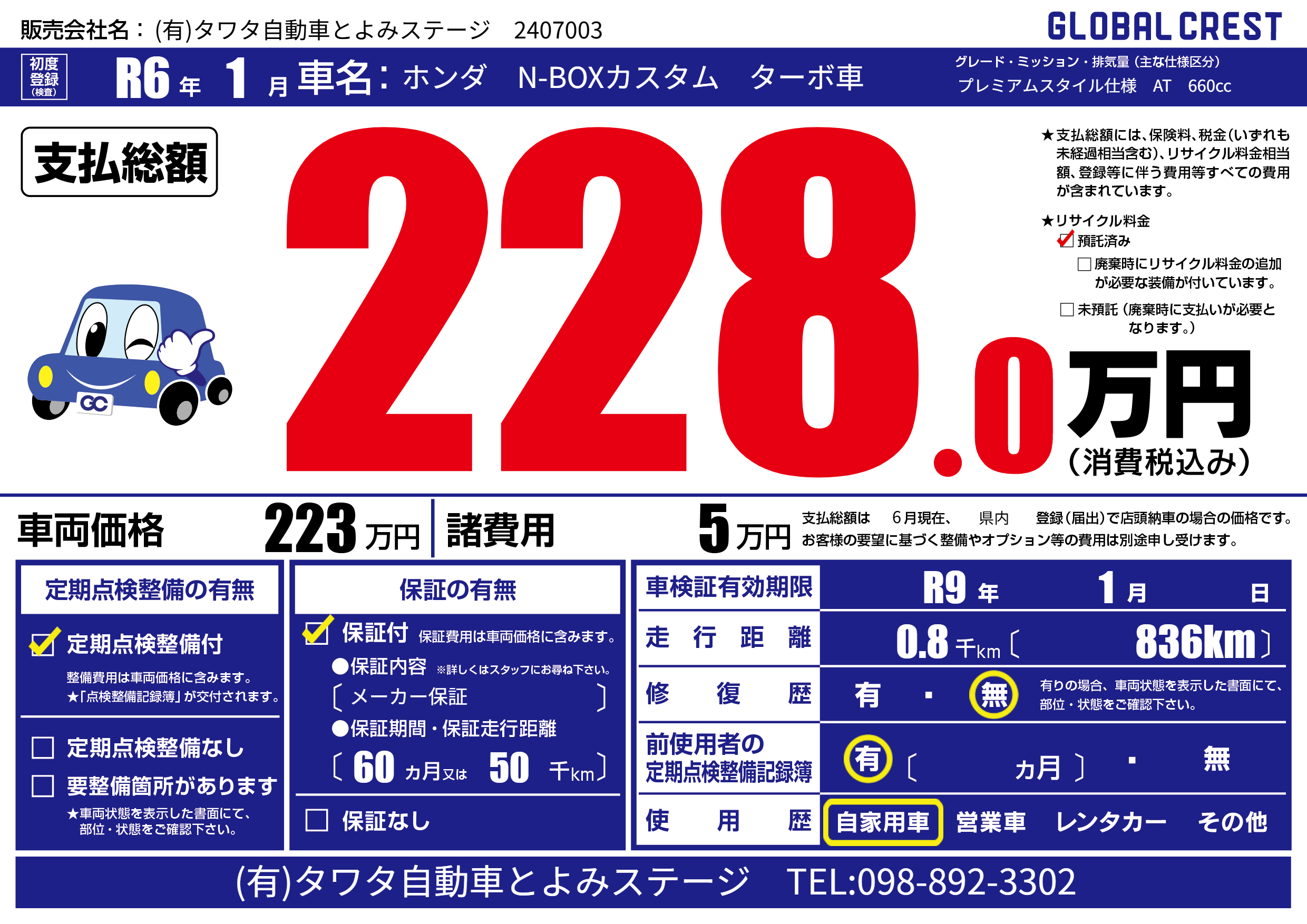 | 車名 | ホンダ N-BOXカスタム ターボ車 | グレード ミッション 排気量 |