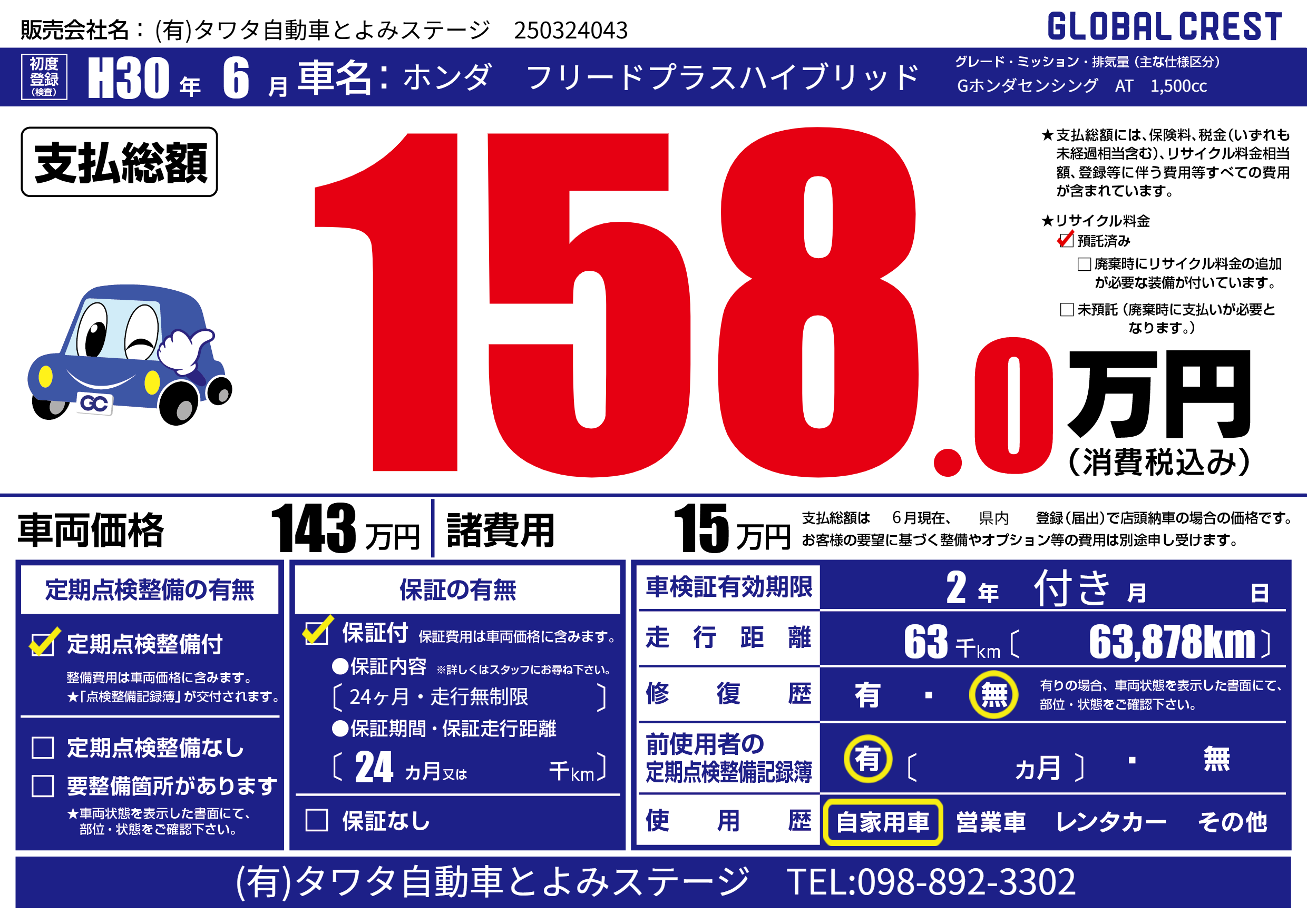 | 車名 | ホンダ フリードプラスハイブリッド | グレード ミッション 排気量 |