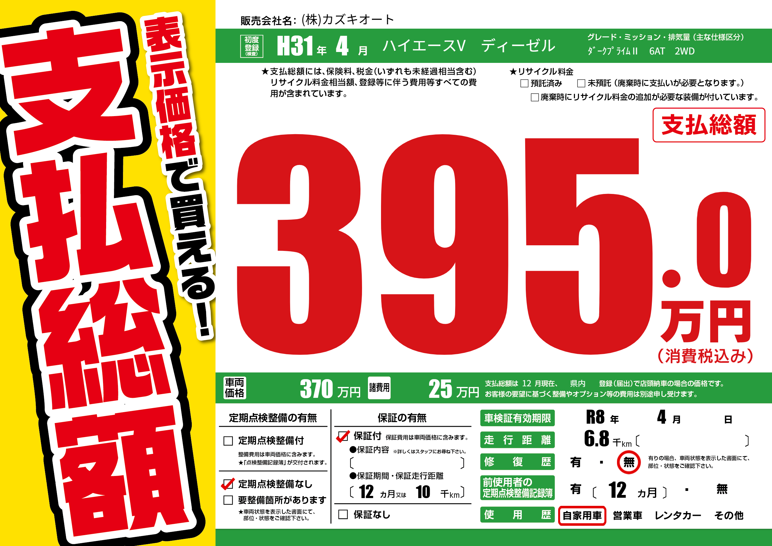 | 車名 | ハイエースV ディーゼル | グレード ミッション 排気量 |