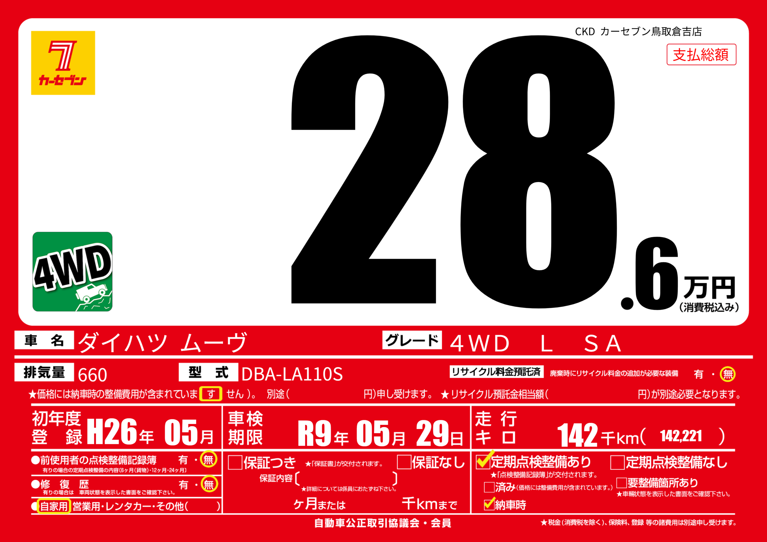 | 車名 | ダイハツ ムーヴ | グレード ミッション 排気量 |