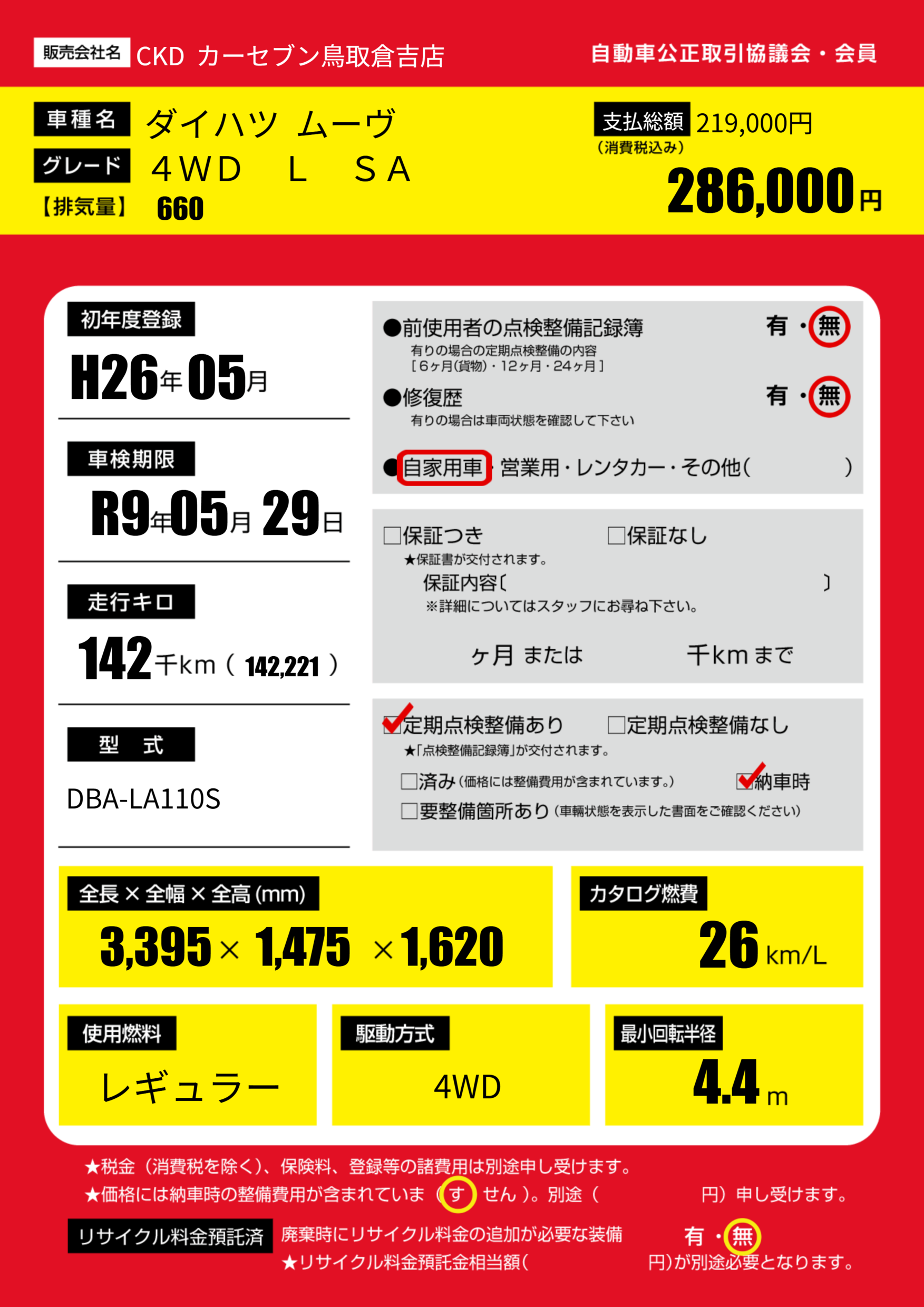 | 車名 | ダイハツ ムーヴ | グレード ミッション 排気量 |