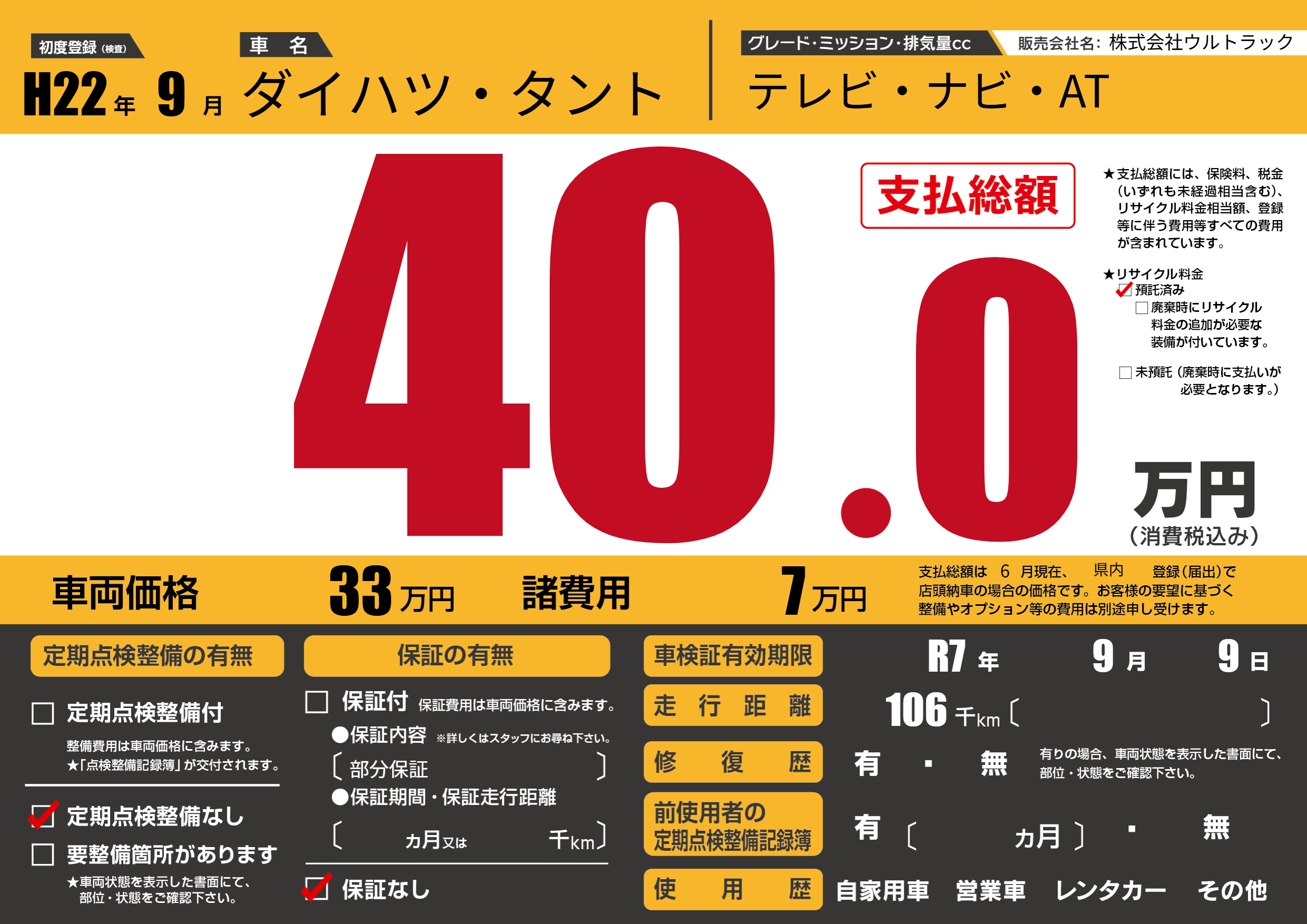 | 走行キロ | 10.6万km | 初年度登録 | H22年9月 |
