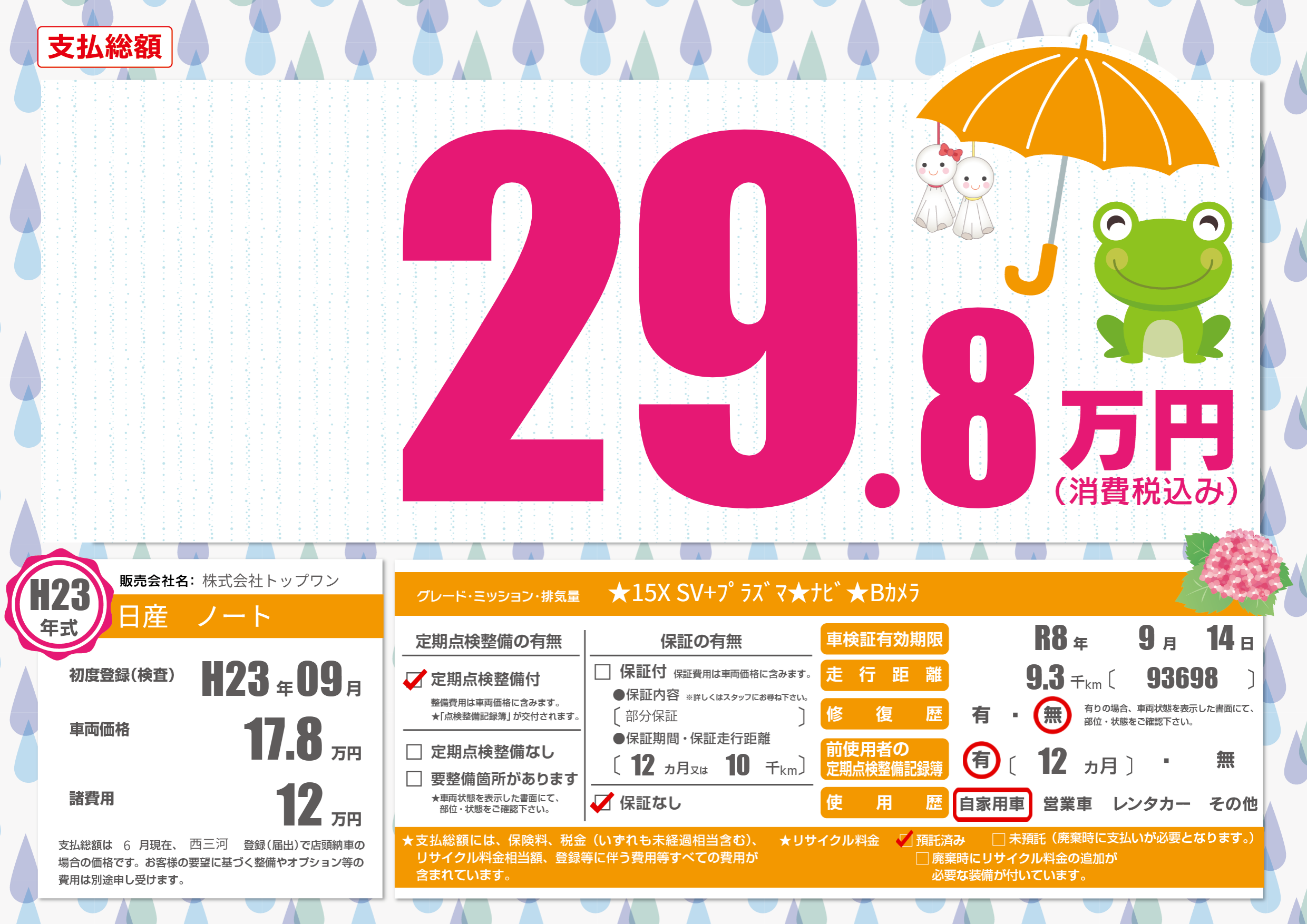 | 走行キロ | 0.9万km | 初年度登録 | H23年09月 |