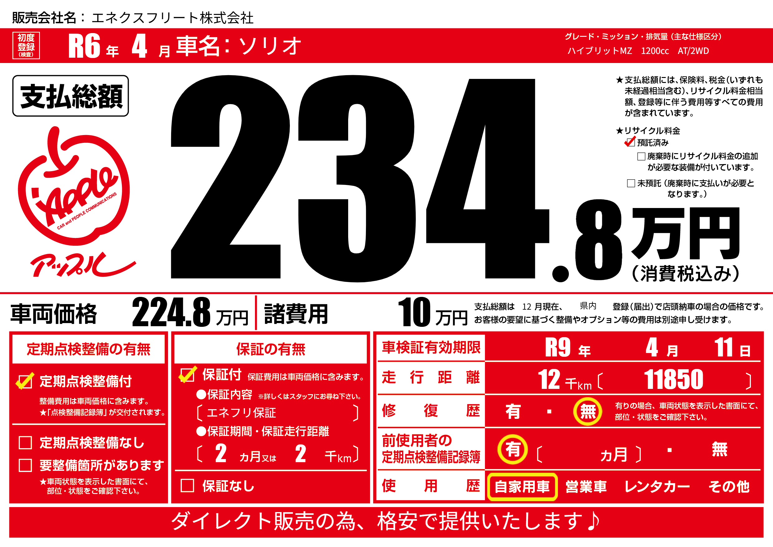 保証付き 保証内容(エネフリ保証) 2ヶ月または(2)千kmまで |