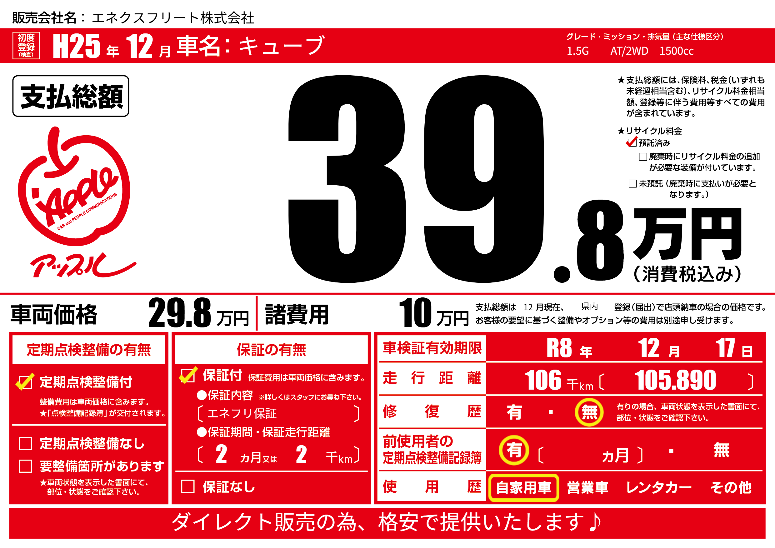 保証付き 保証内容(エネフリ保証) 2ヶ月または(2)千kmまで |