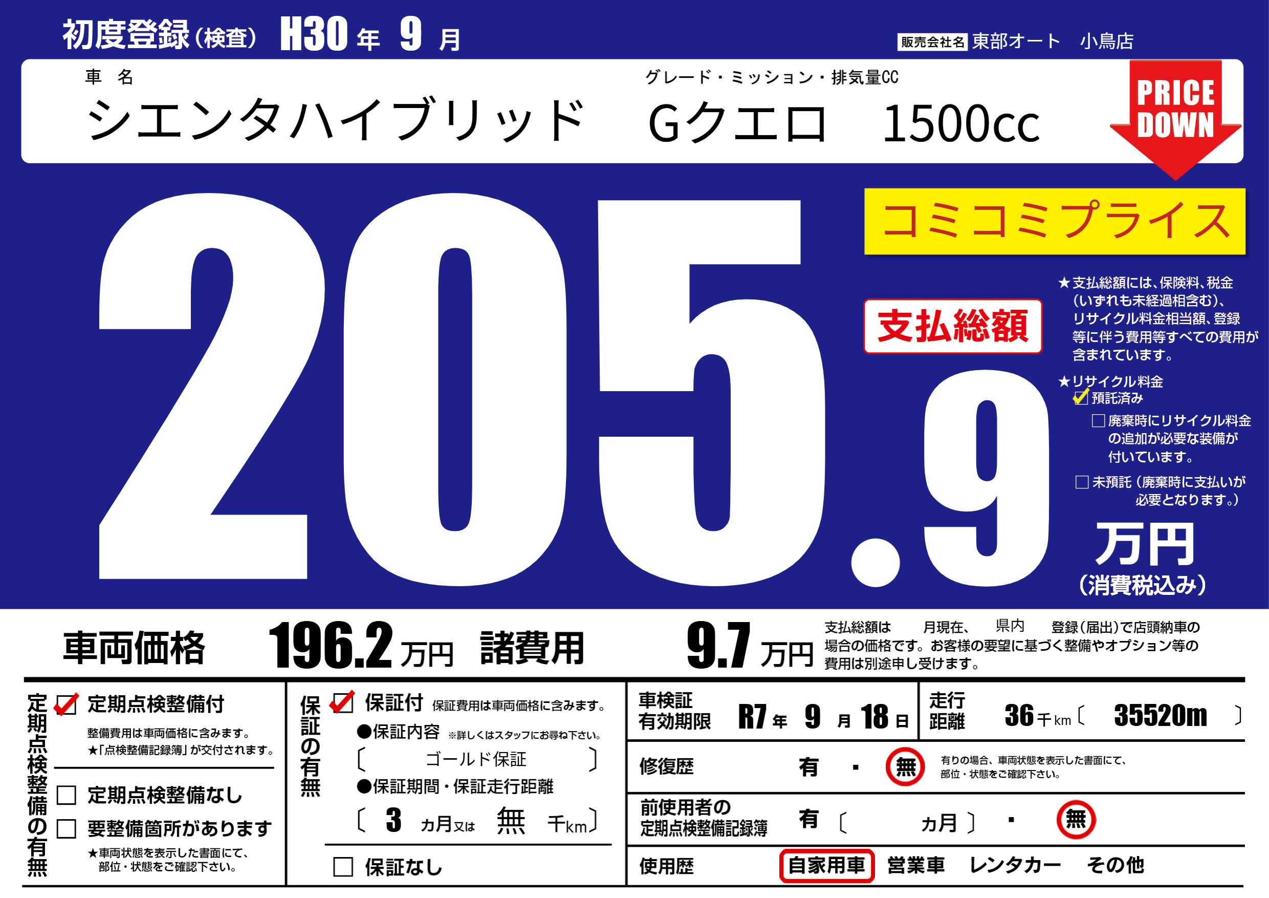 | 車名 | シエンタハイブリッド | グレード ミッション 排気量 |