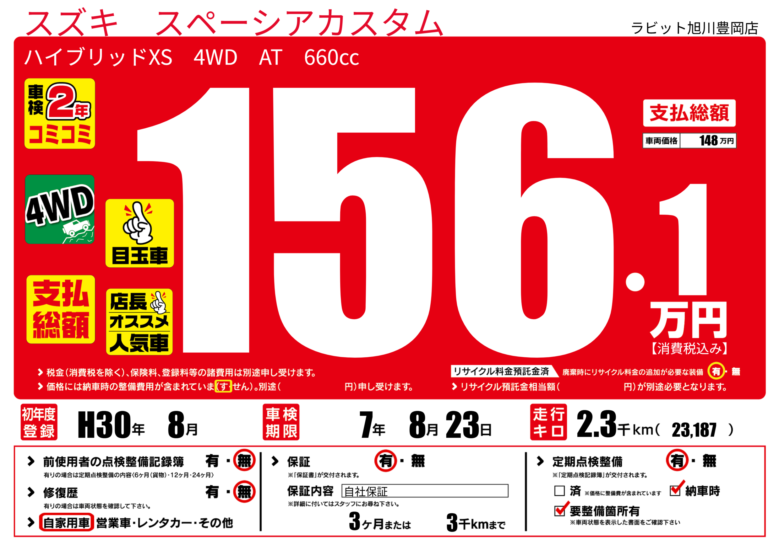 | 走行キロ | 0.2万km | 初年度登録 | H30年8月 |