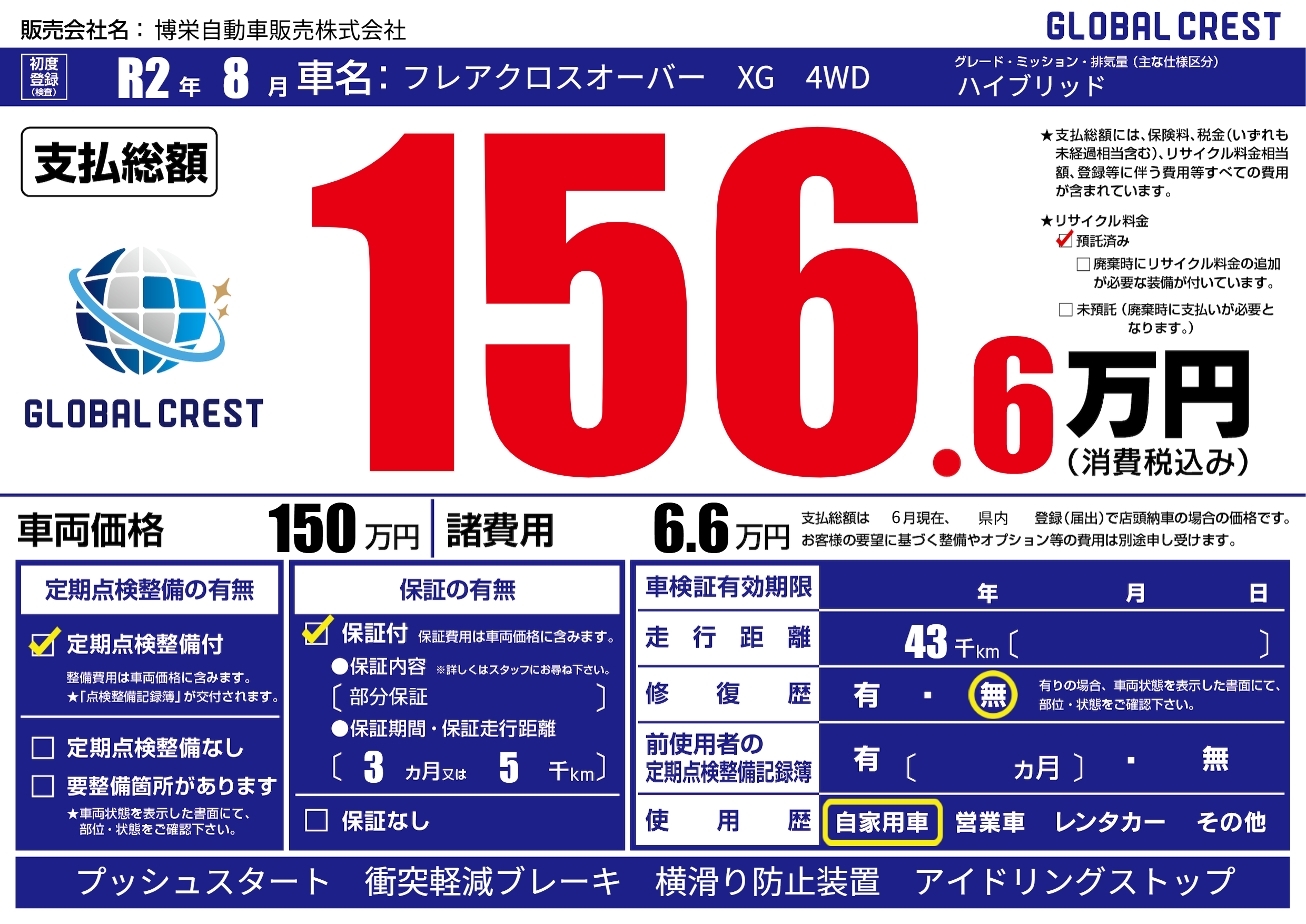 | 車名 | フレアクロスオーバー XG 4WD | グレード ミッション 排気量 |