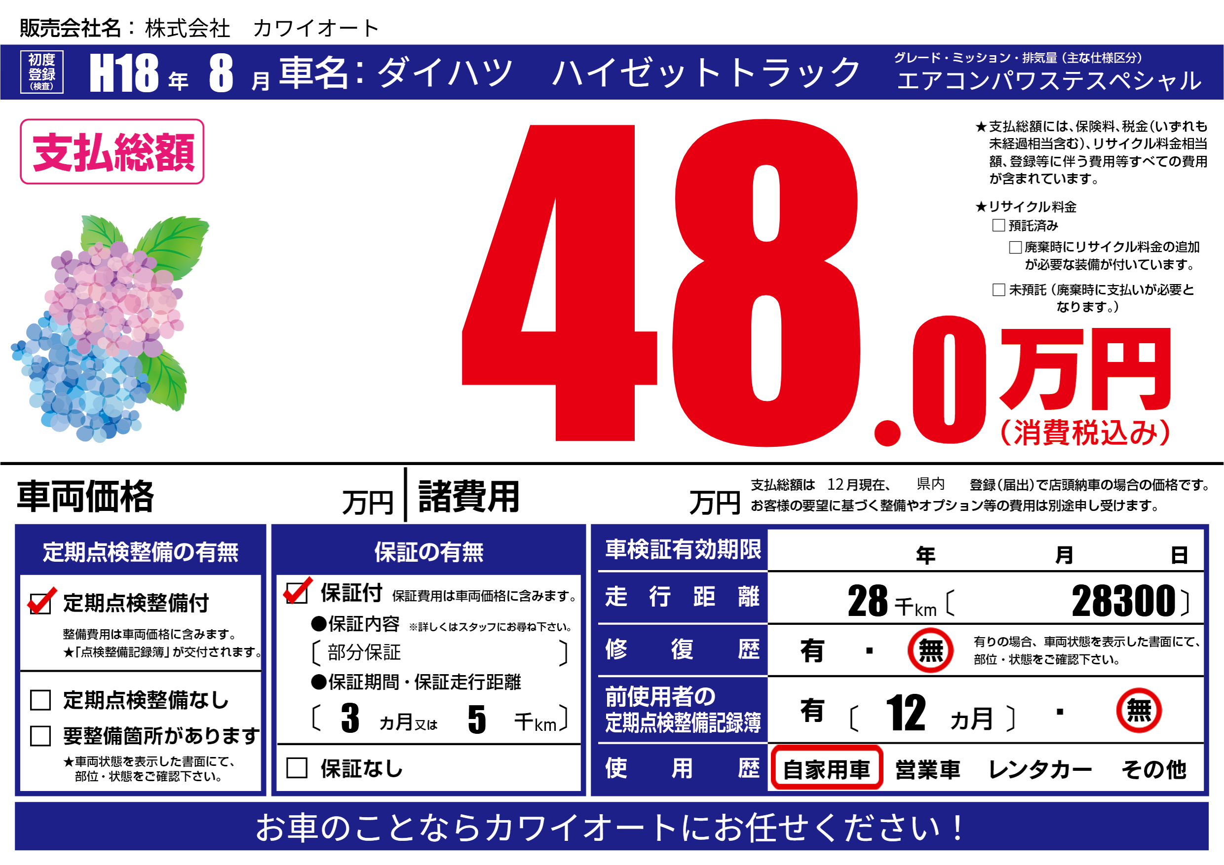 | 走行キロ | 2.8万km | 初年度登録 | H18年8月 |