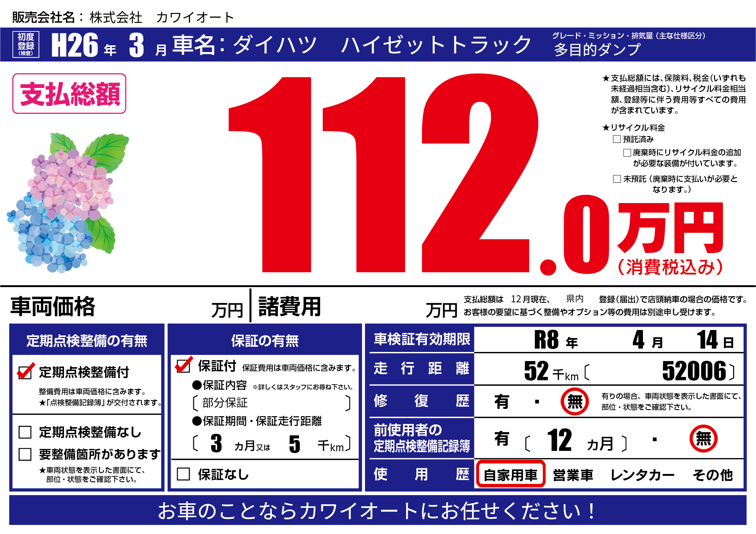 | 走行キロ | 5.2万km | 初年度登録 | H26年3月 |
