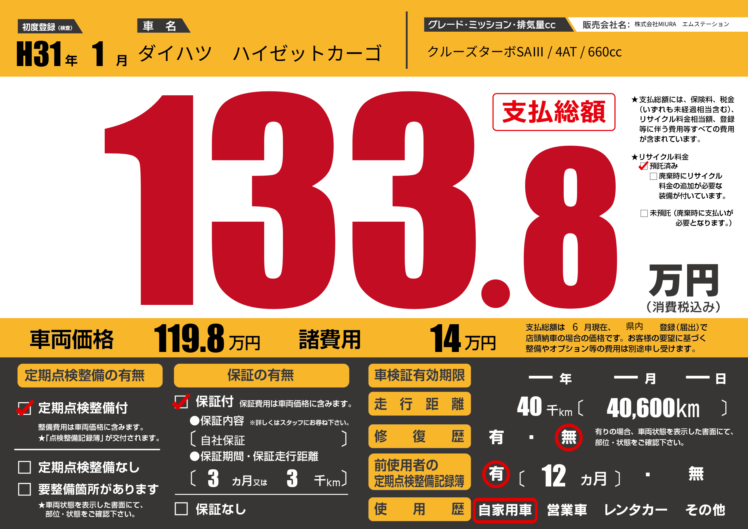 | 走行キロ | 4万km | 初年度登録 | H31年1月 |