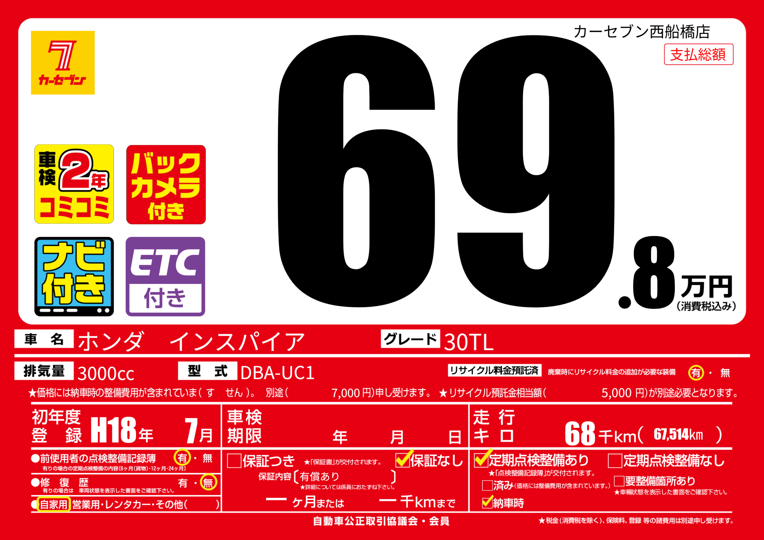 | 走行キロ | 6.8万km | 初年度登録 | H18年7月 |