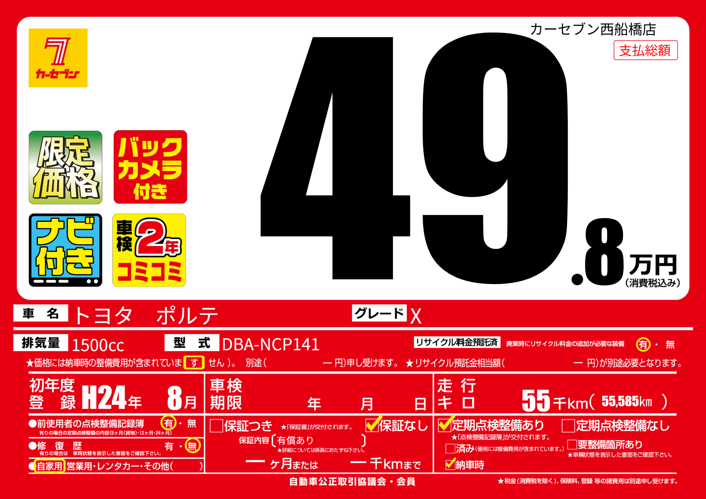 | 車名 | トヨタ ポルテ | グレード ミッション 排気量 |
