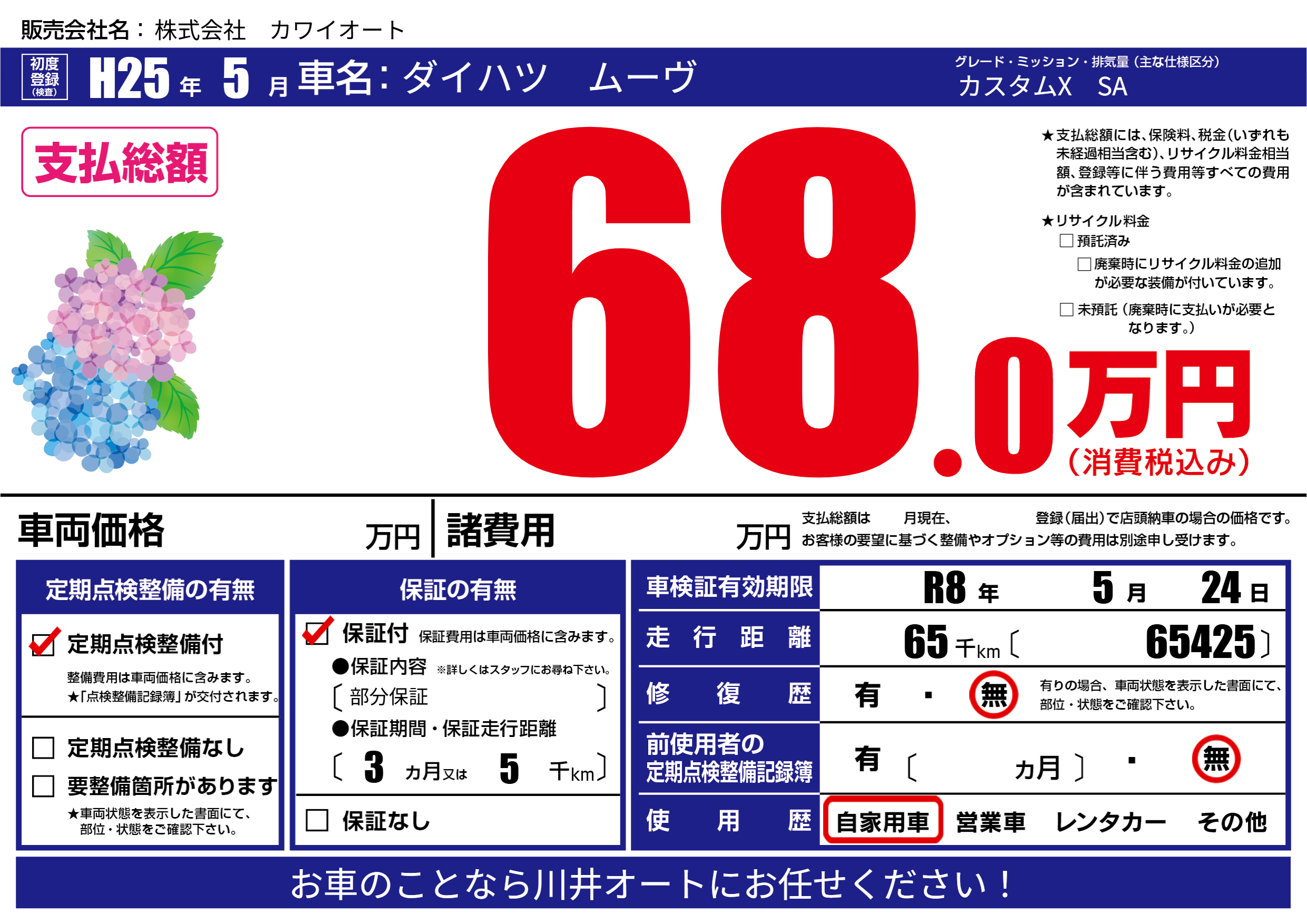 | 走行キロ | 6.5万km | 初年度登録 | H25年5月 |