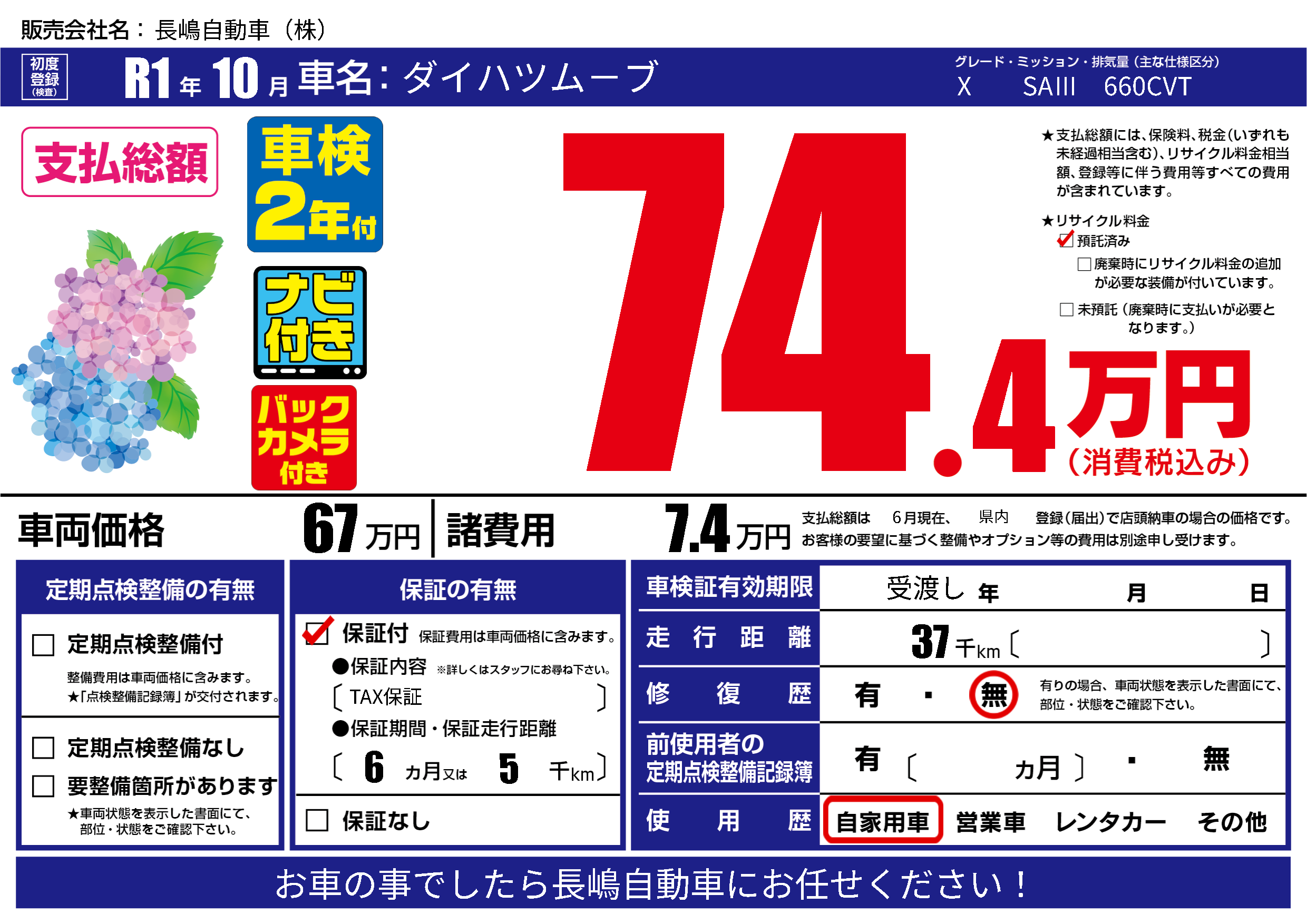 保証付き 保証内容(TAX保証) 6ヶ月または(5)千kmまで |