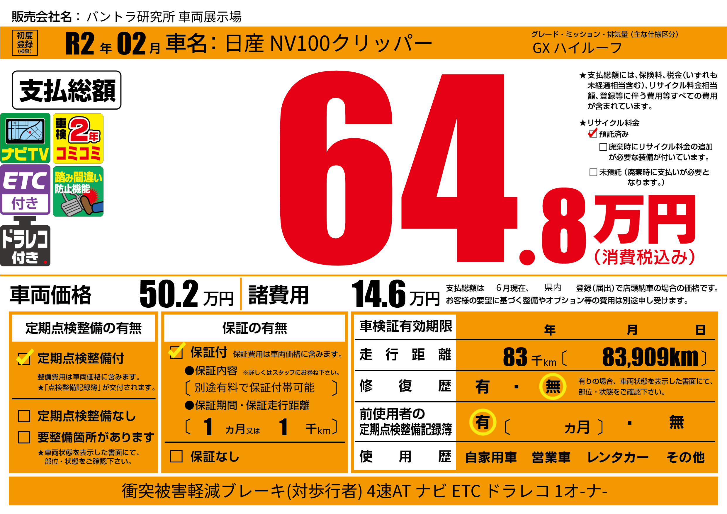 | 車名 | 日産 NV100クリッパー | グレード ミッション 排気量 |