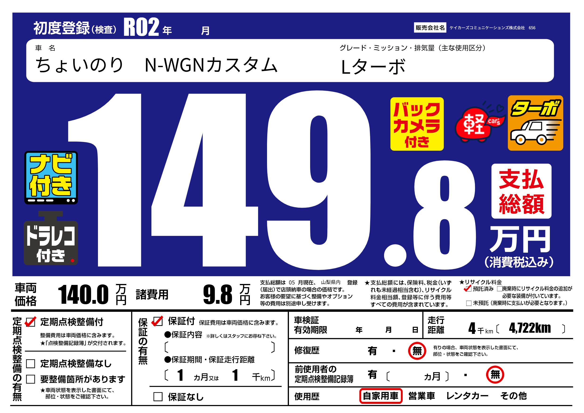 | 車名 | ちょいのり N-WGNカスタム | グレード ミッション 排気量 |