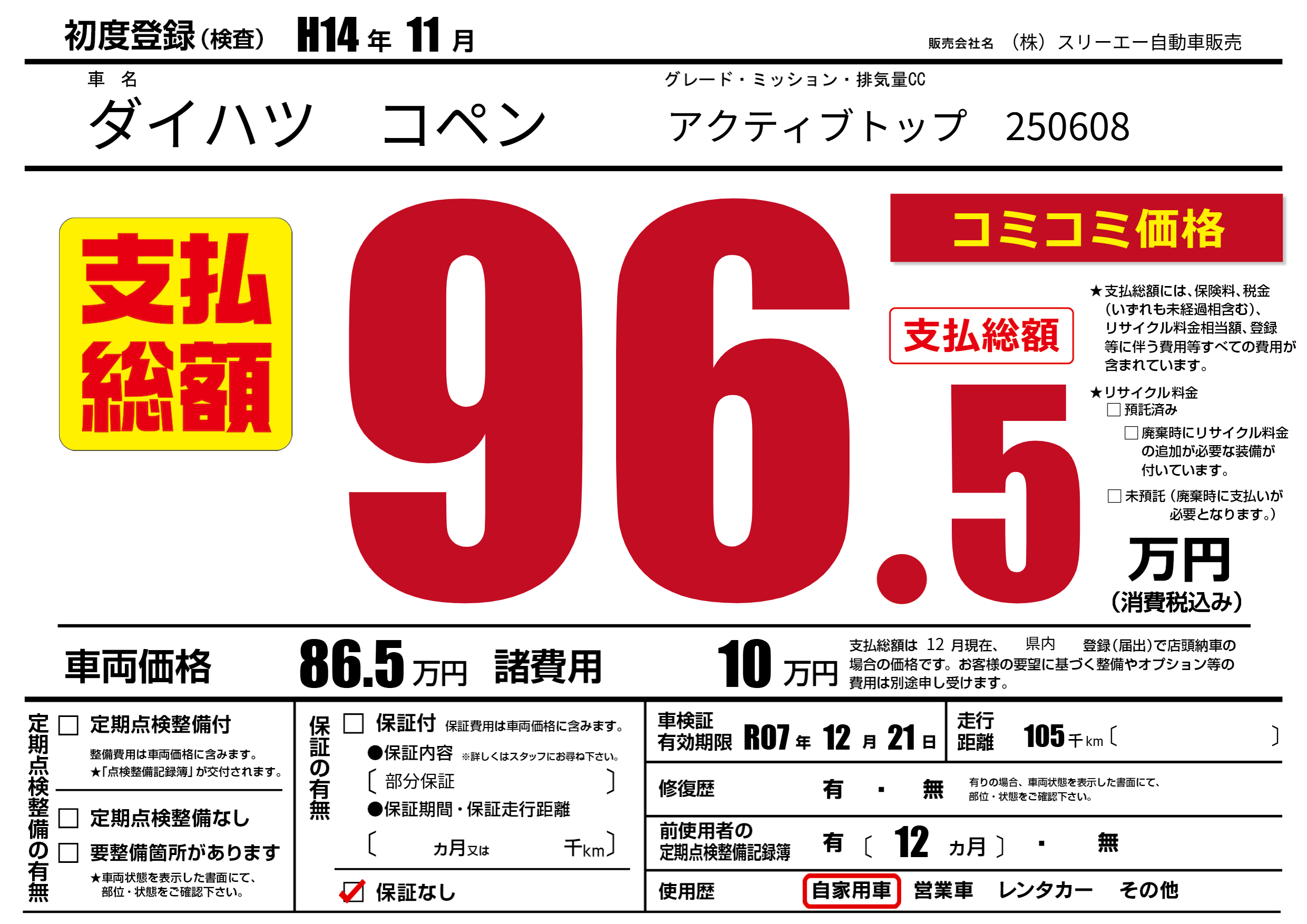 | 車名 | ダイハツ コペン | グレード ミッション 排気量 |