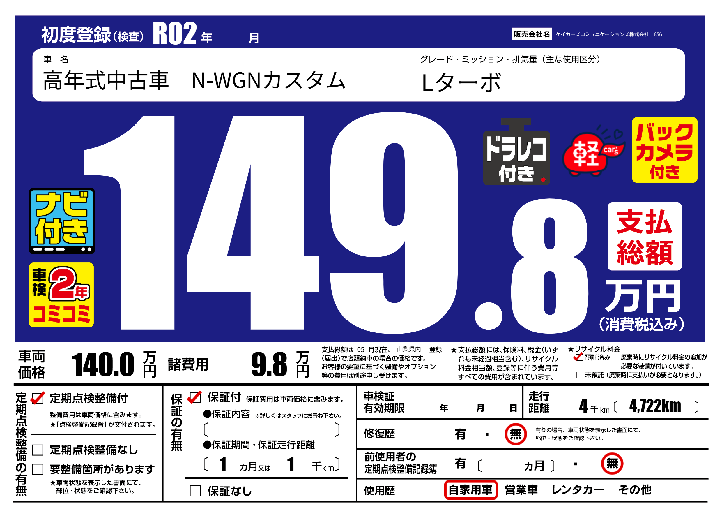 | 車名 | 高年式中古車 N-WGNカスタム | グレード ミッション 排気量 |
