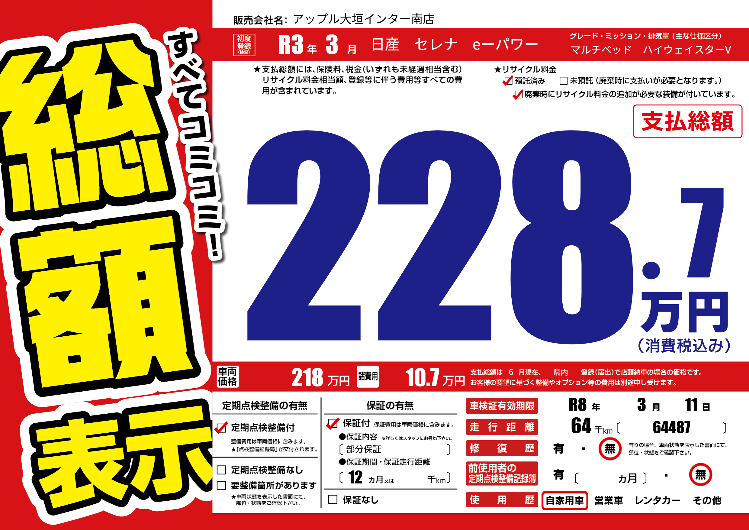| 車名 | 日産 セレナ eーパワー | グレード ミッション 排気量 |