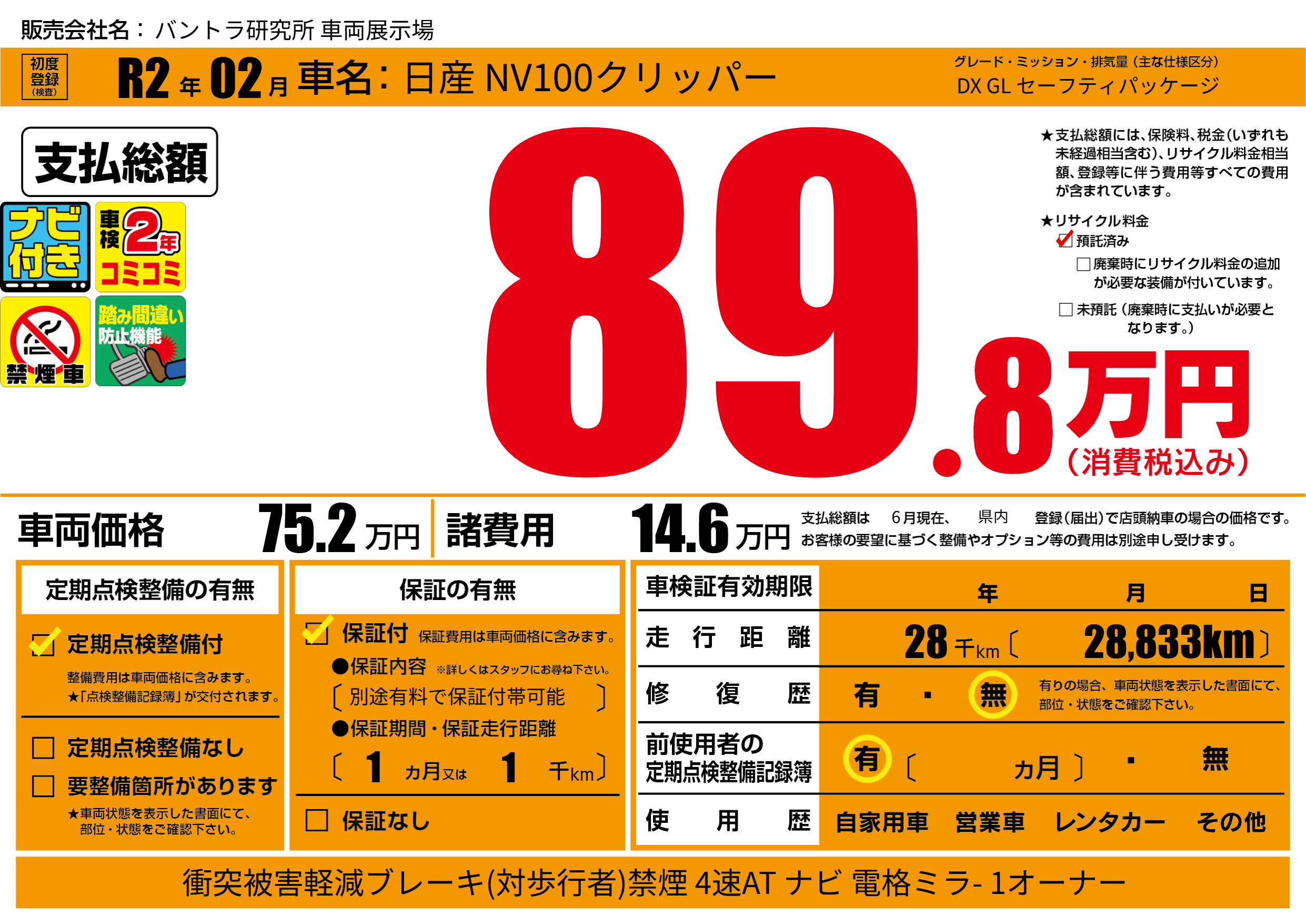 | 車名 | 日産 NV100クリッパー | グレード ミッション 排気量 |